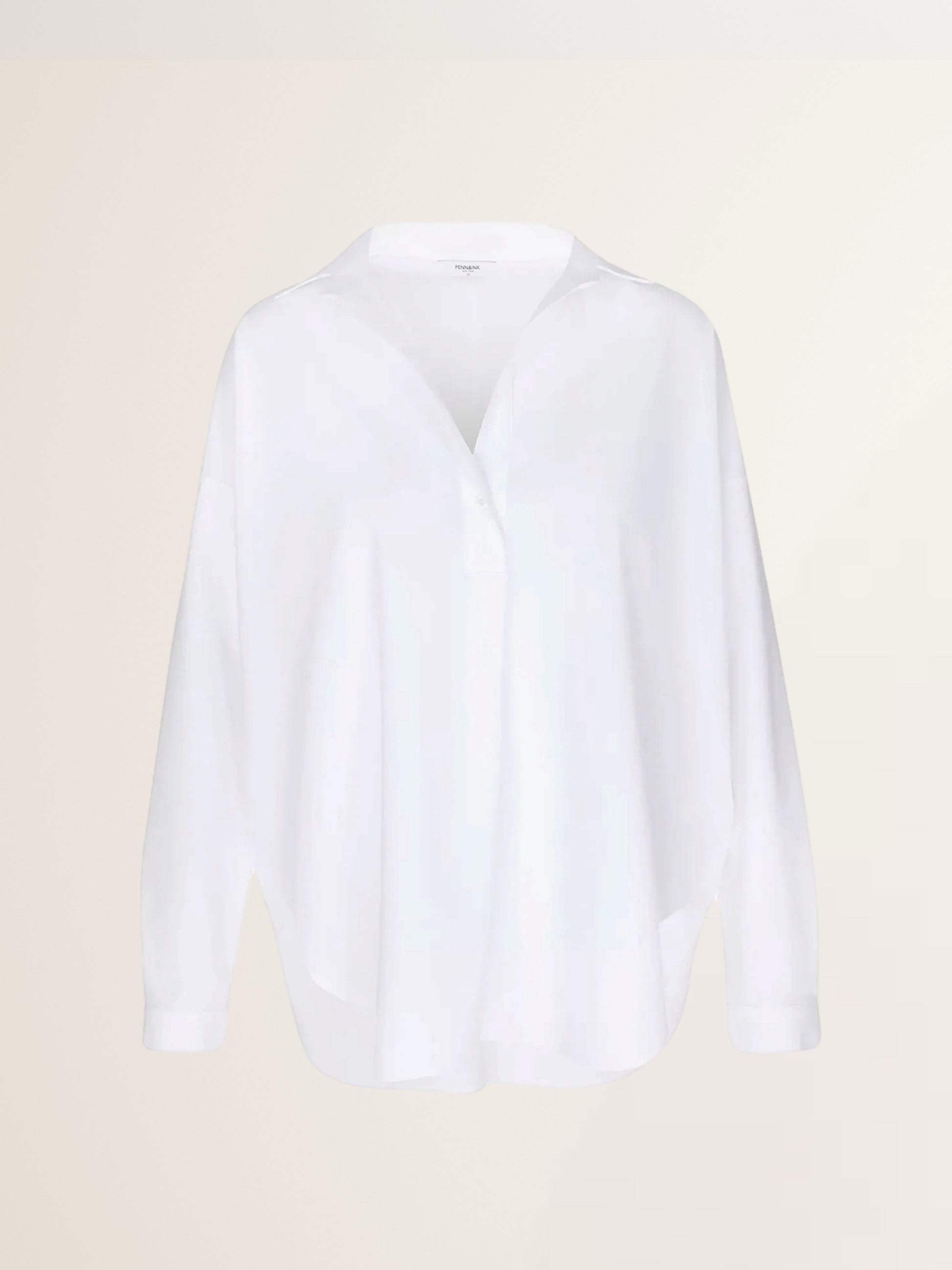 Women's blouse made of techno stretch, V-neck collar, long sleeves with cuffs, loose fit with rounded hem.