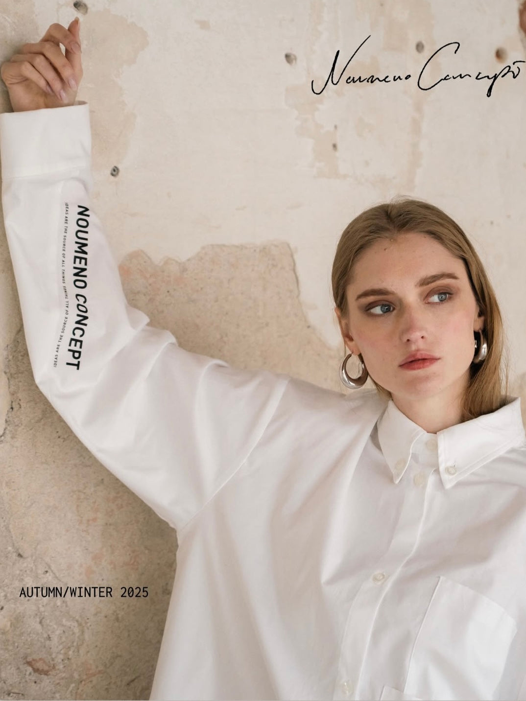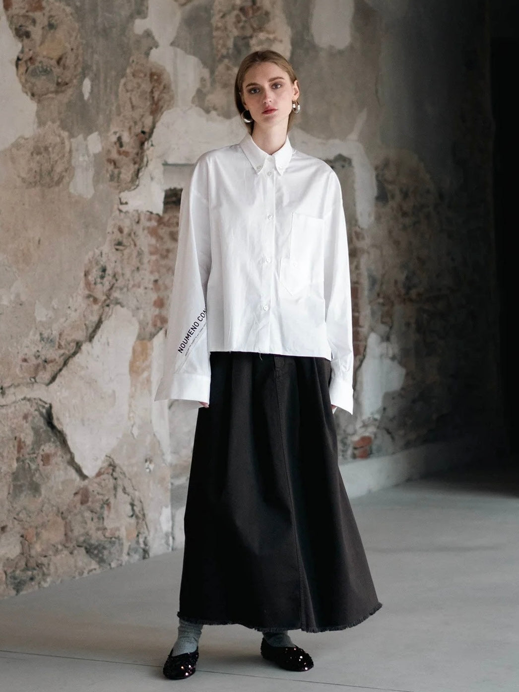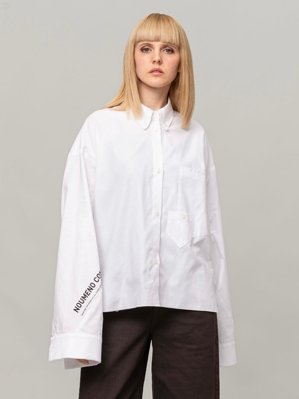 Boxy-cut shirt blouse with an Oxford collar, wide sleeves with a logo print on the right sleeve, and a large breast pocket at the front, along with a smaller pocket underneath.