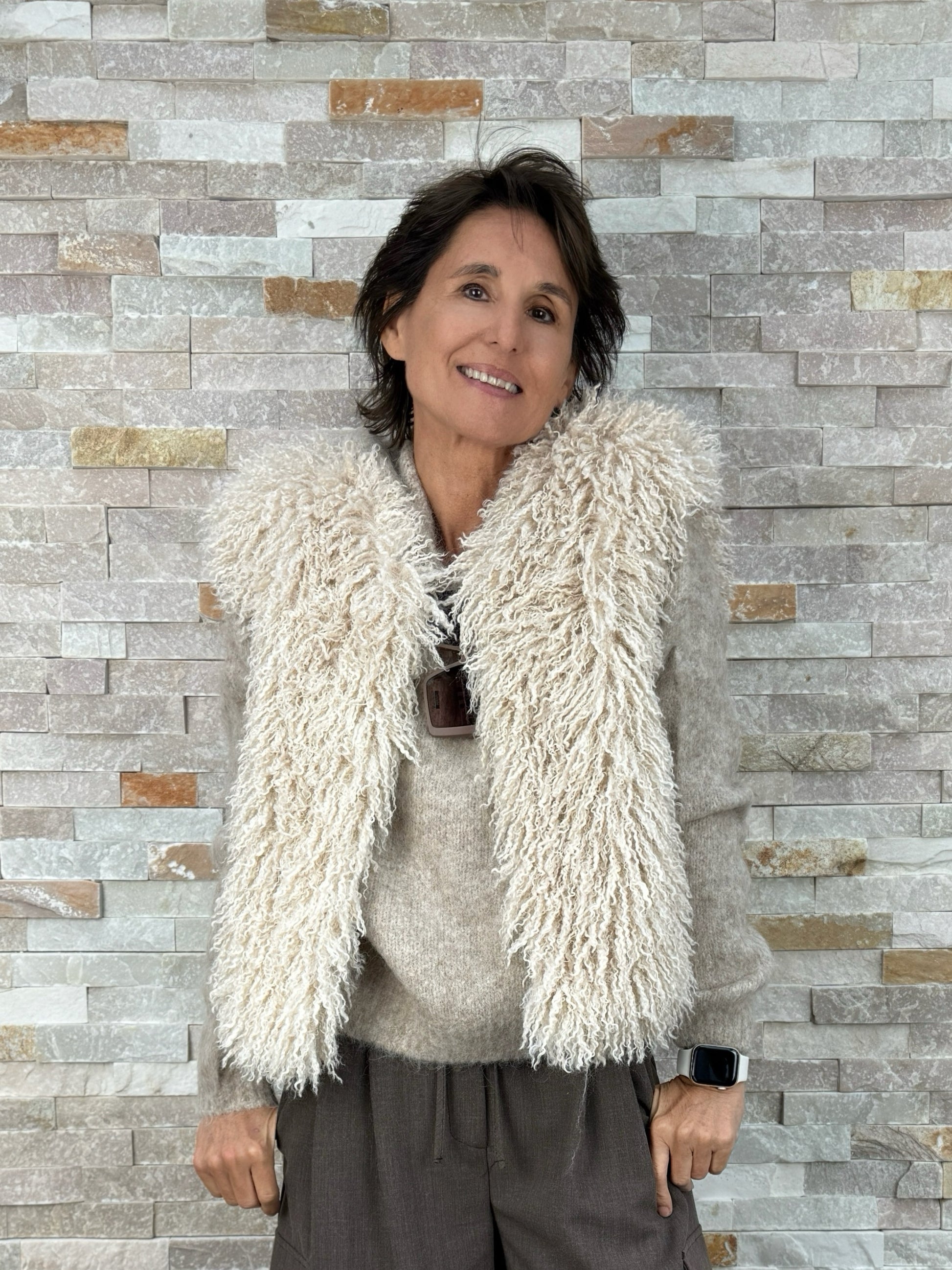 Small faux lambskin vest with a round neck and hook closure. Beautiful printed lining.