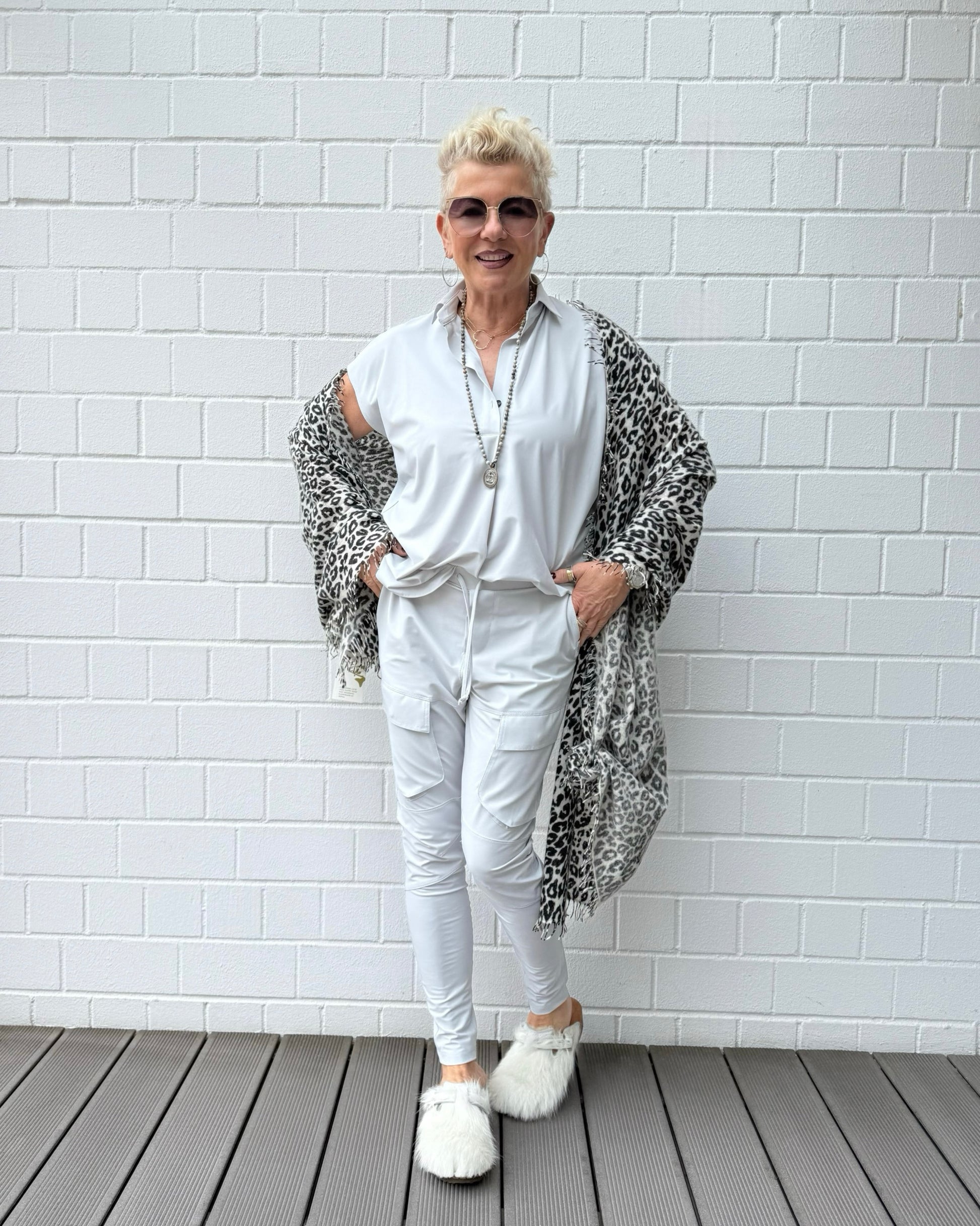 Großer Schal mit Fransen aus superweichem Baby Cashmere. Leoparden Print in Schwarz auf Hellgrau.