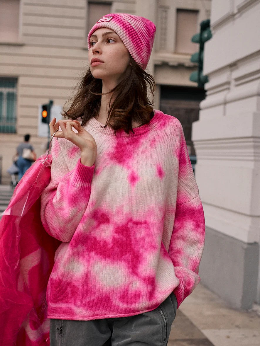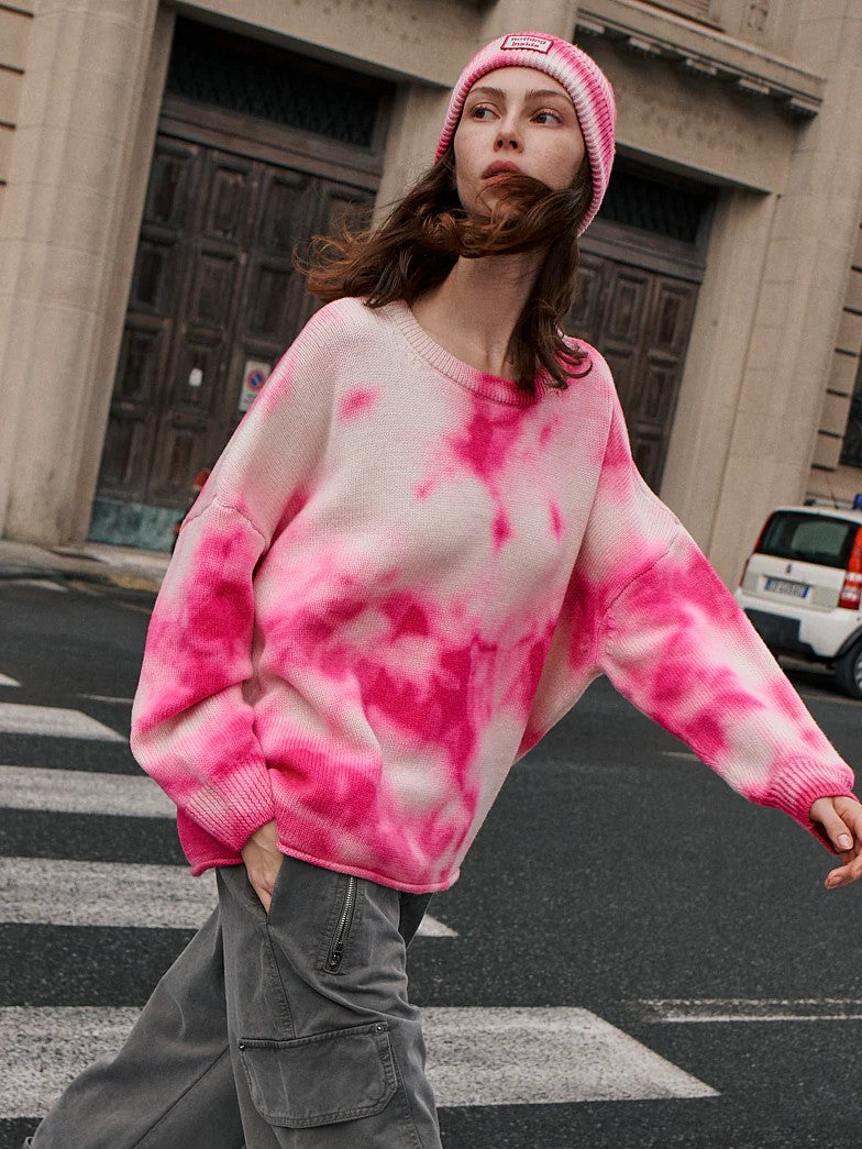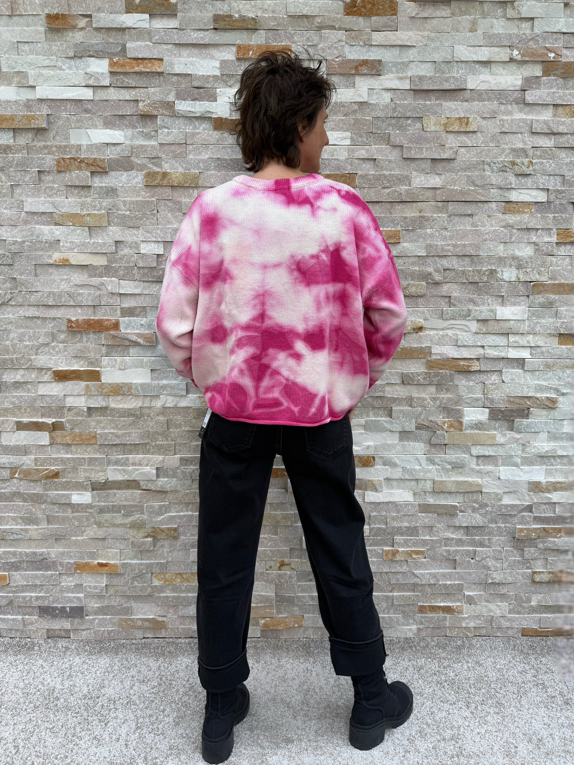 Lassiger Batik Pullover aus reiner Wolle. Der neonpinke Sweater in Batik Optik bringt starke Streetwear-Energie in deinen Look. Auffällig, ohne zu übertreiben – ein Piece für alle, die klare Kante zeigen und ihren Style selbst bestimmen. Bequem, edgy und absolut zeitgemäß.