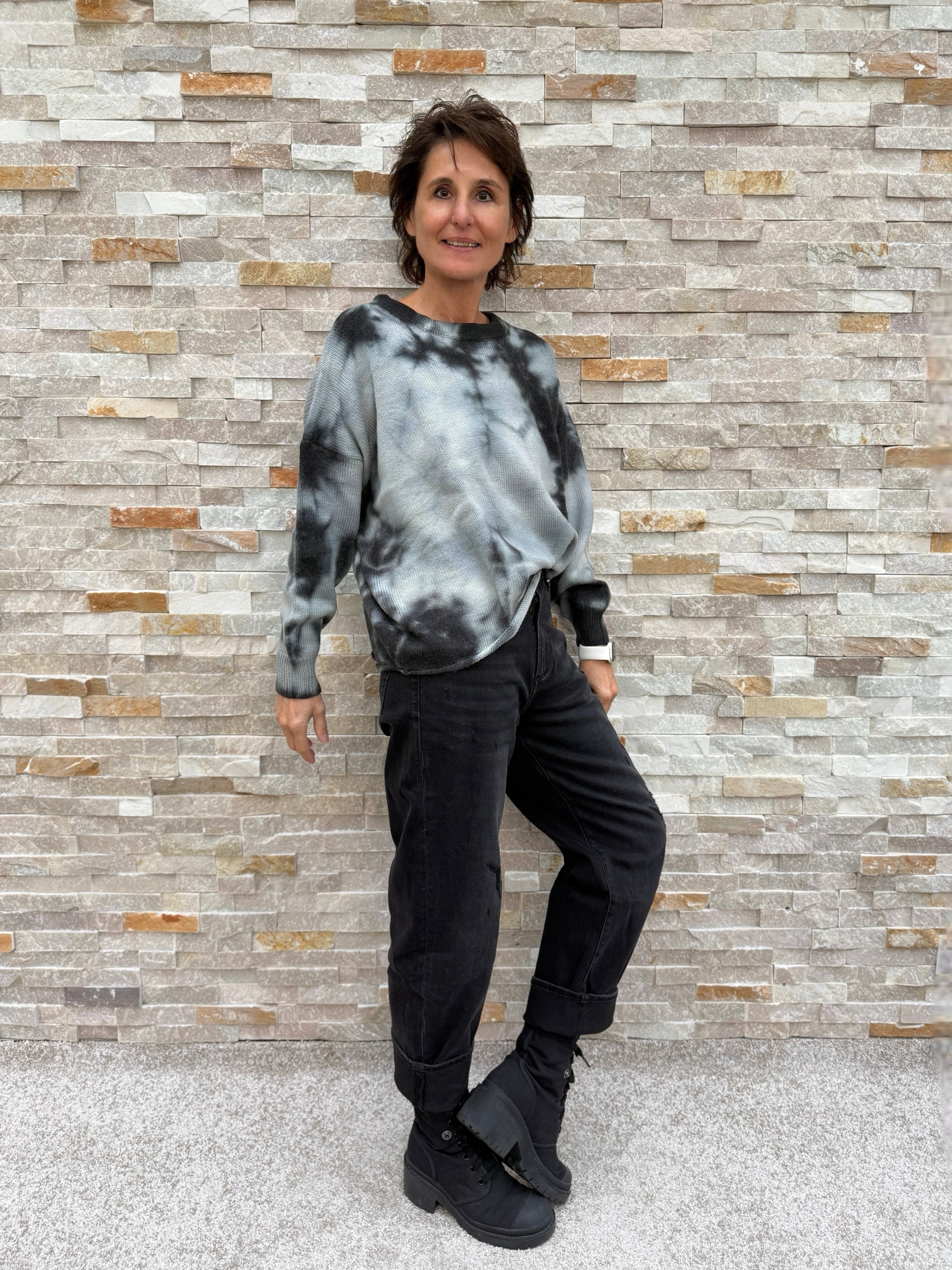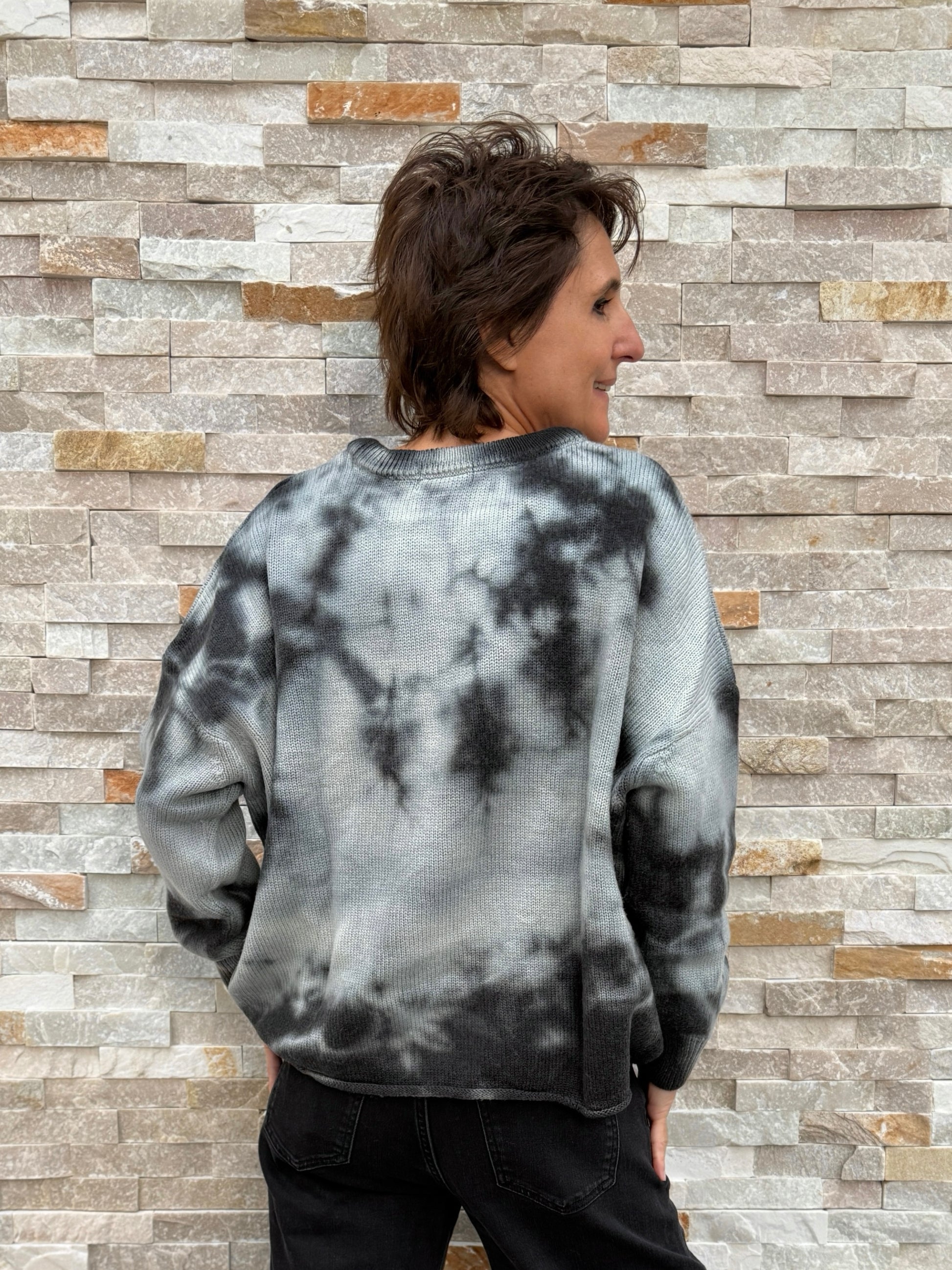 Lassiger Batik Pullover aus reiner Wolle. Der schwarz-graue Sweater in Batik Optik bringt starke Streetwear-Energie in deinen Look. Auffällig, ohne zu übertreiben – ein Piece für alle, die klare Kante zeigen und ihren Style selbst bestimmen. Bequem, edgy und absolut zeitgemäß.
