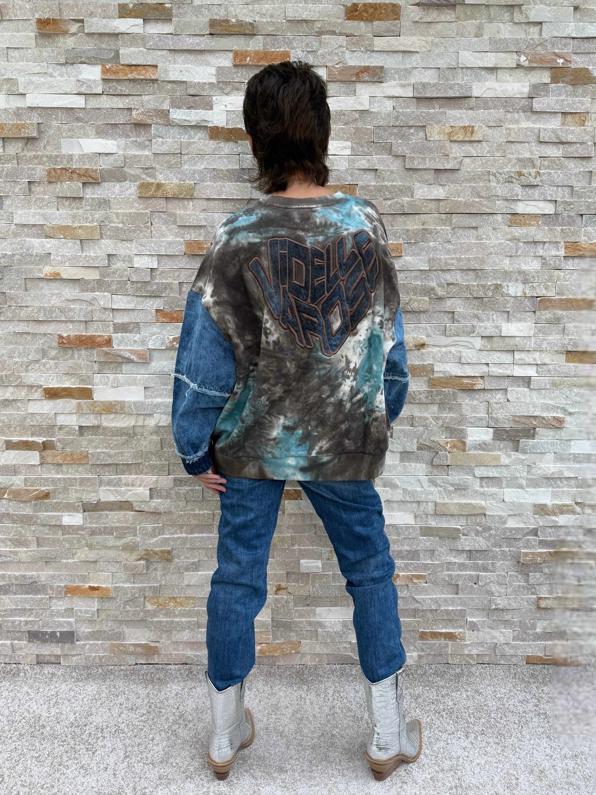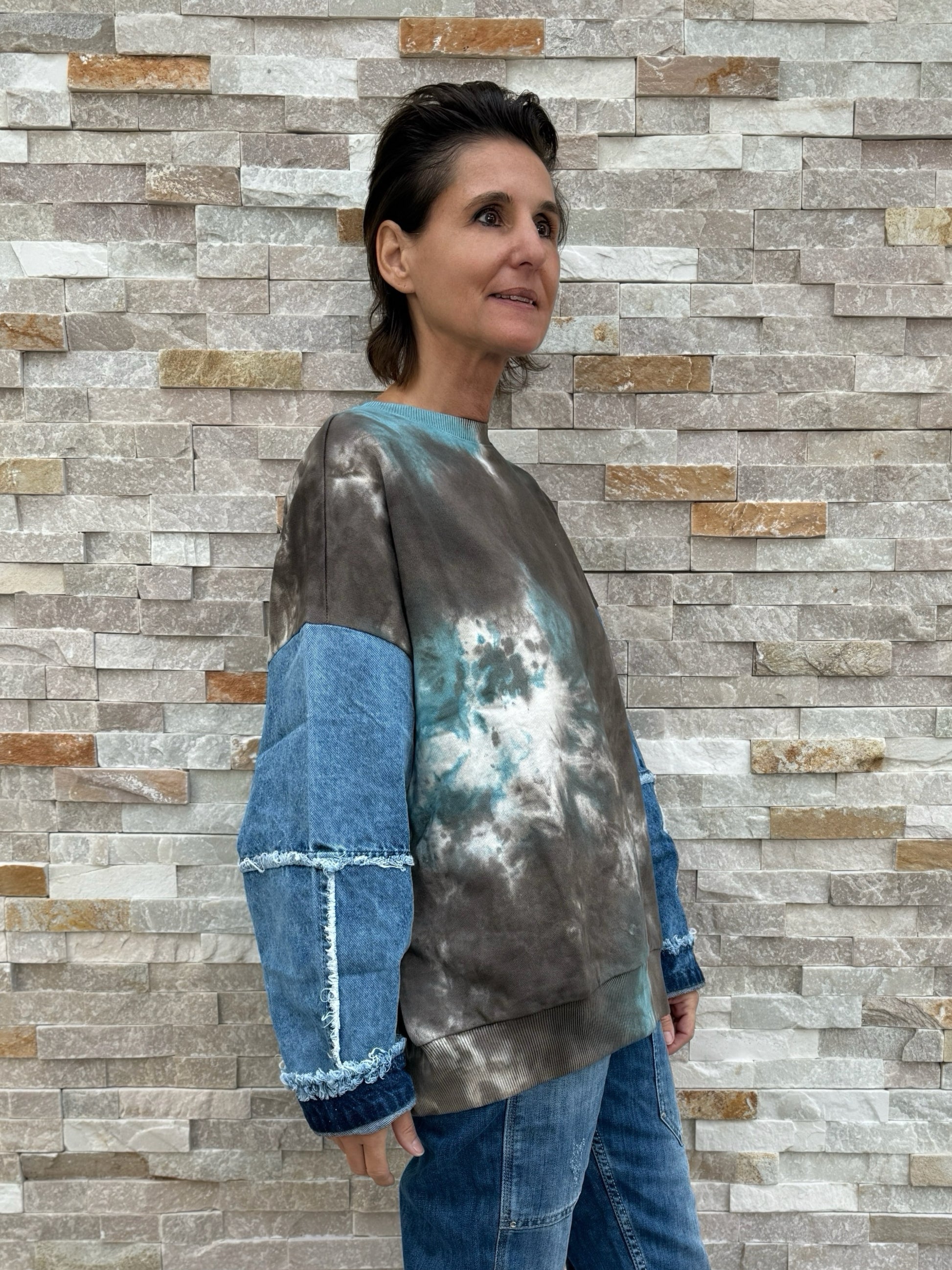 Cooles Sweatshirt mit Denim-Ärmeln. Passt daher hervorragend zu Jeans. Das Batik-Muster ist in Braun-Grün gehalten und sehr gut kombinierbar.