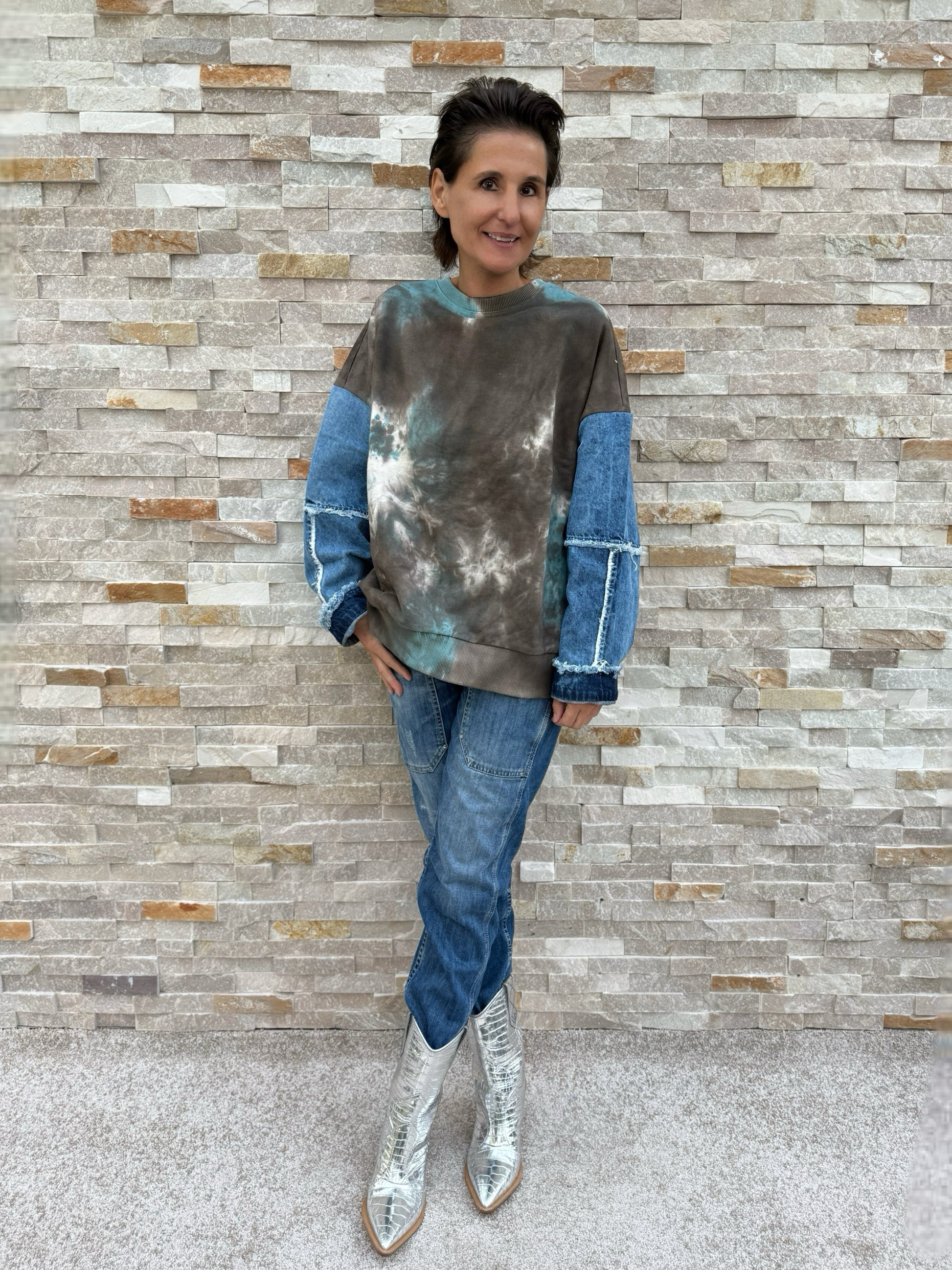 Batik Sweatshirt mit Denim Ärmel Braun-Grün