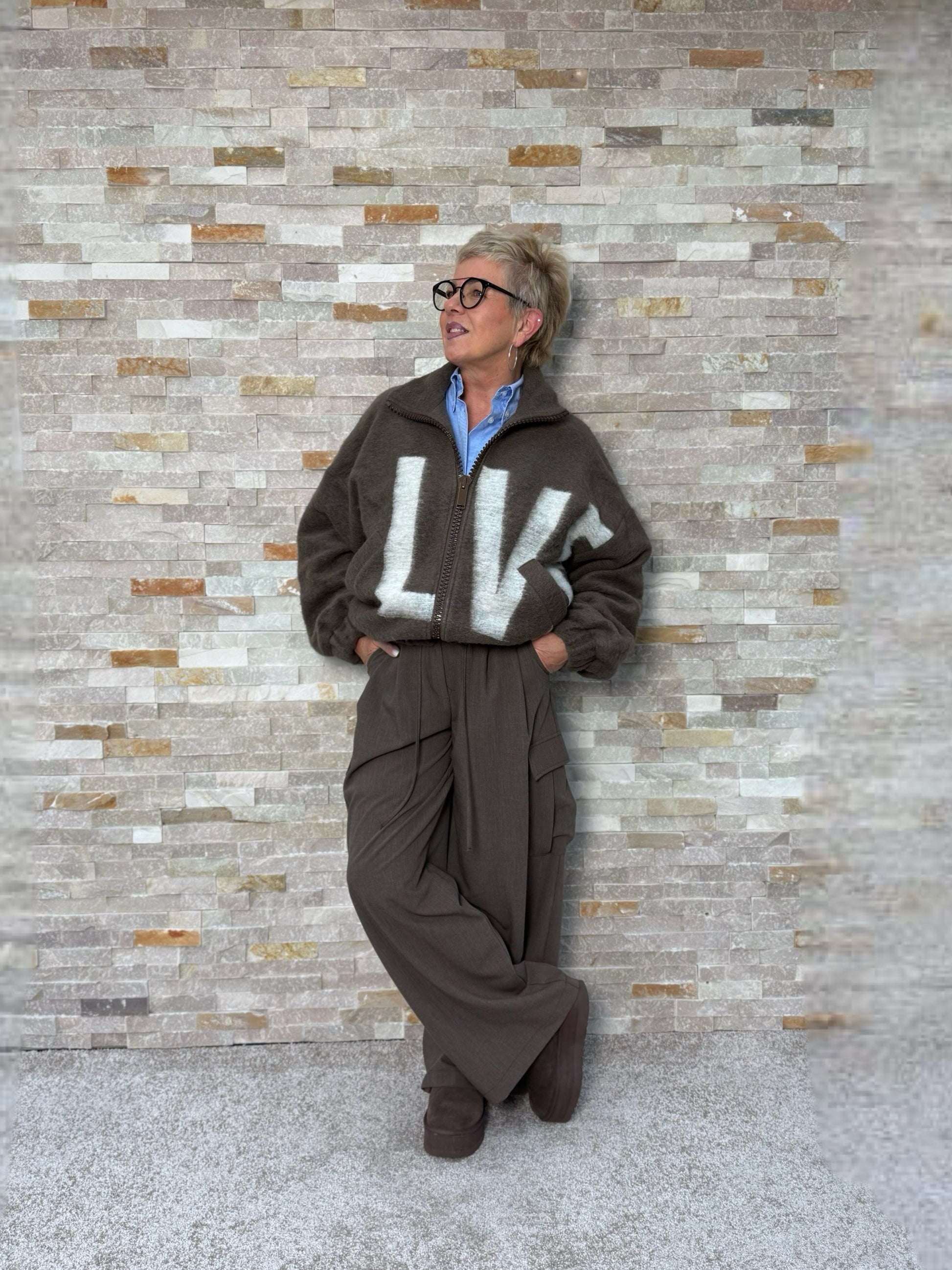 Cargohose in einer fließenden Wolloptik. Bundfalten, Tunnelzug im Bund, große aufgesetzte Taschen, seitliche Eingriffstaschen. Gummizug im hinteren Teil.