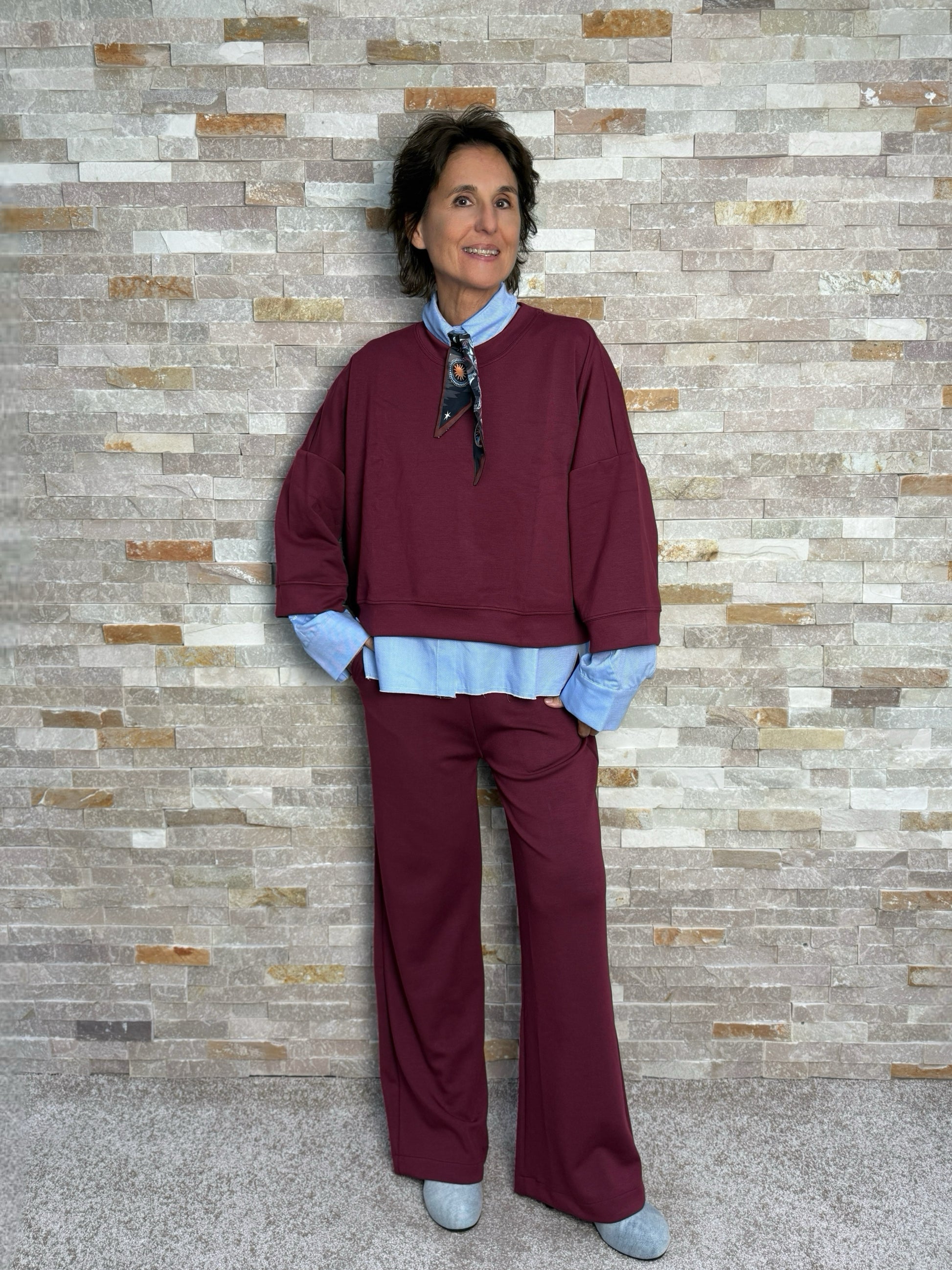 Scuba Sweatshirt in einer verkürzten Form. Boxy mit überschnittener Schulter, hohem Rundhals und 7/8 Ärmel.