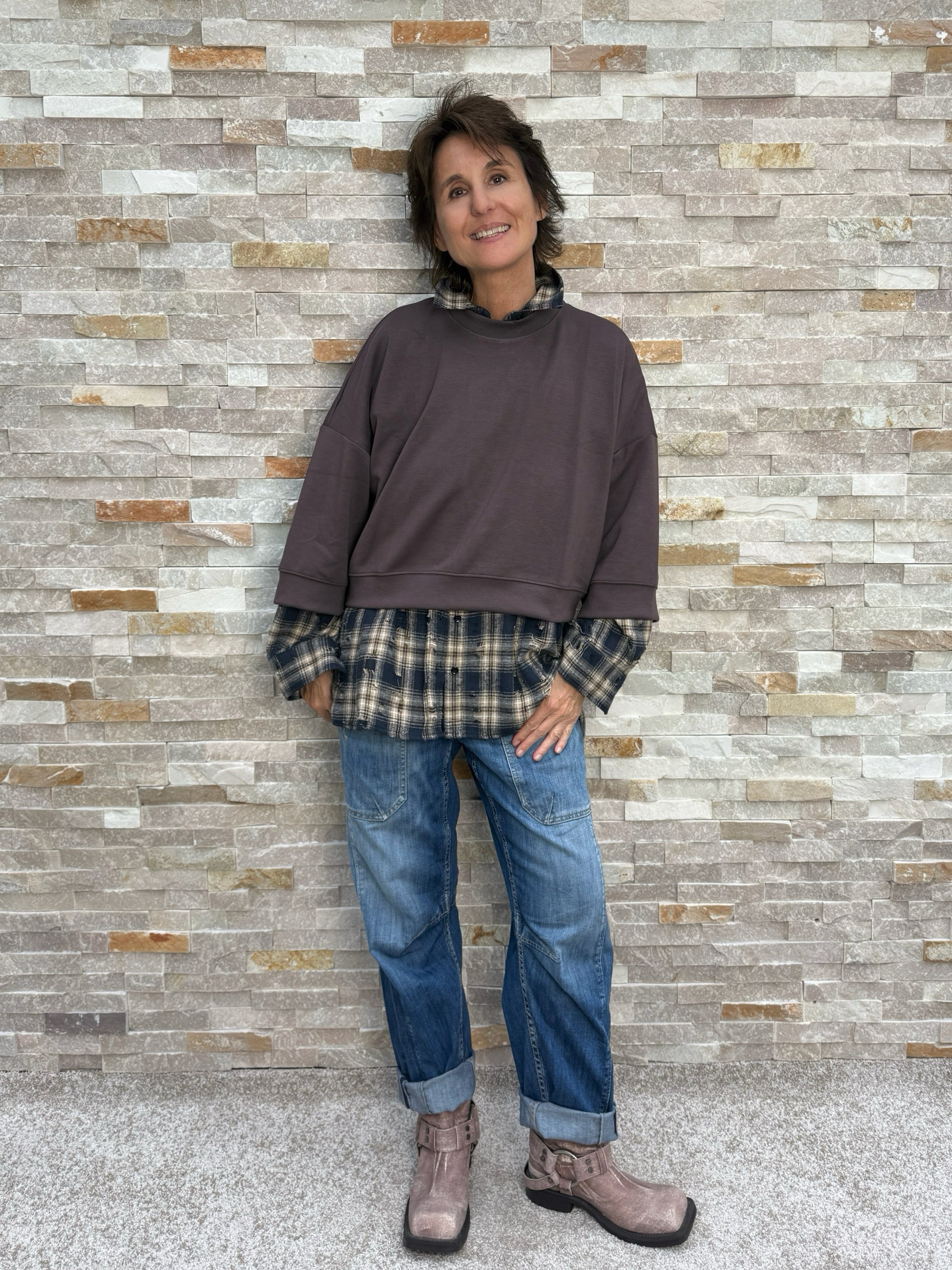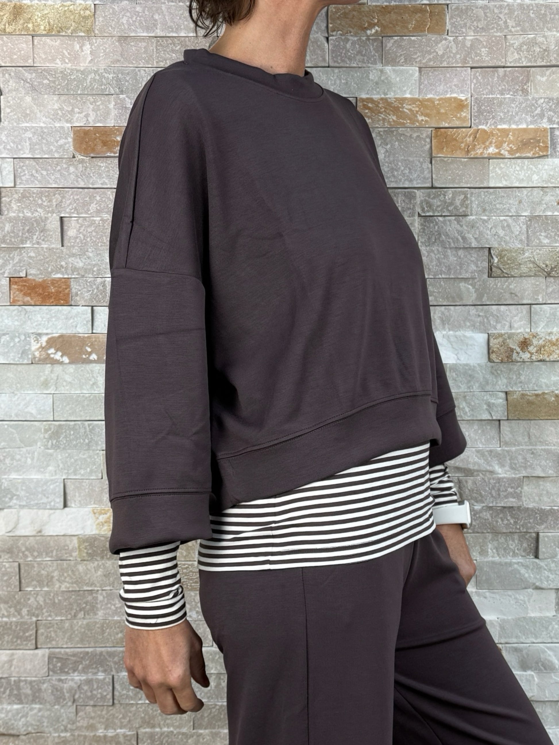 Scuba Sweatshirt in einer verkürzten Form. Boxy mit überschnittener Schulter, hohem Rundhals und 7/8 Ärmel.