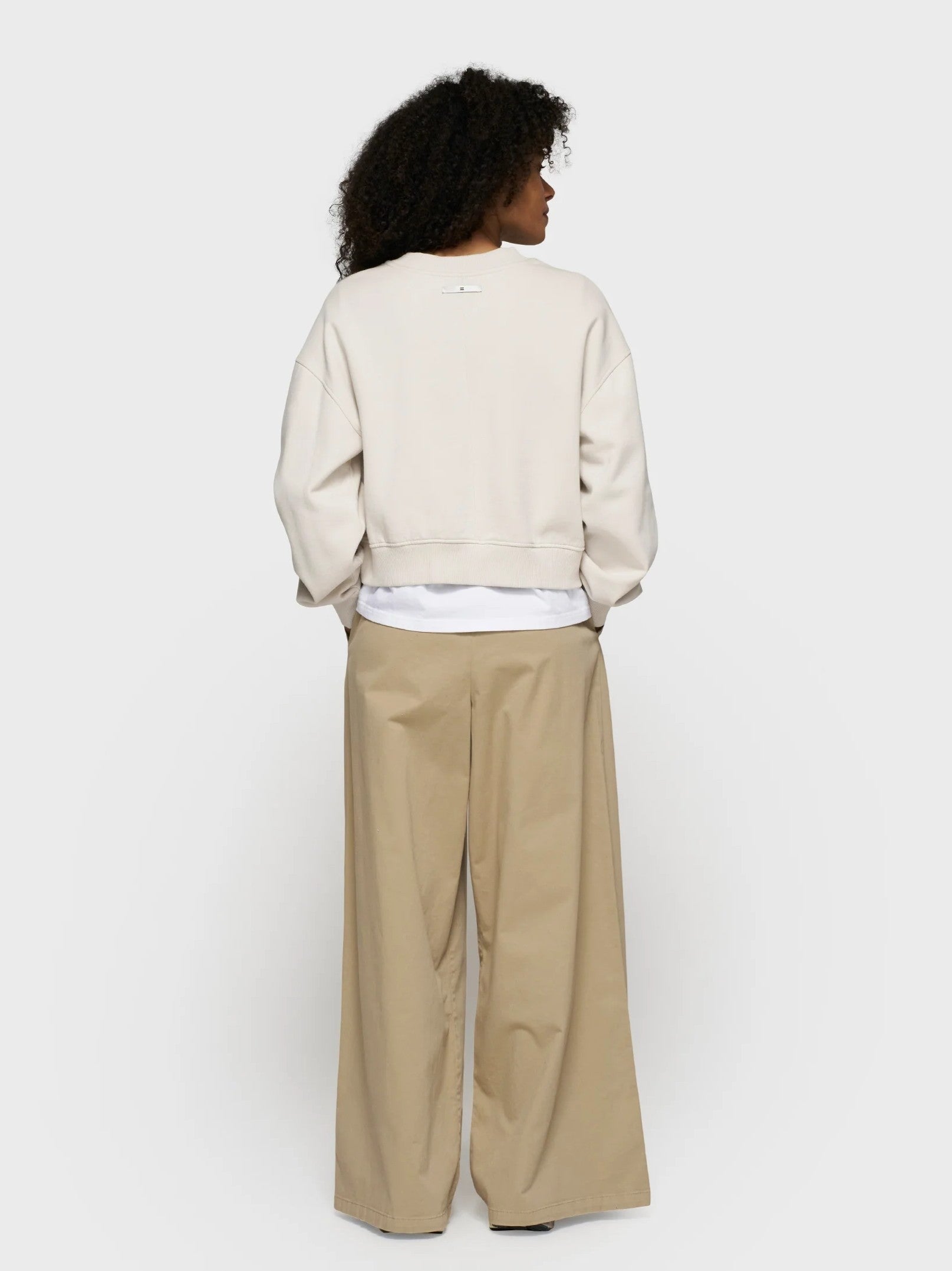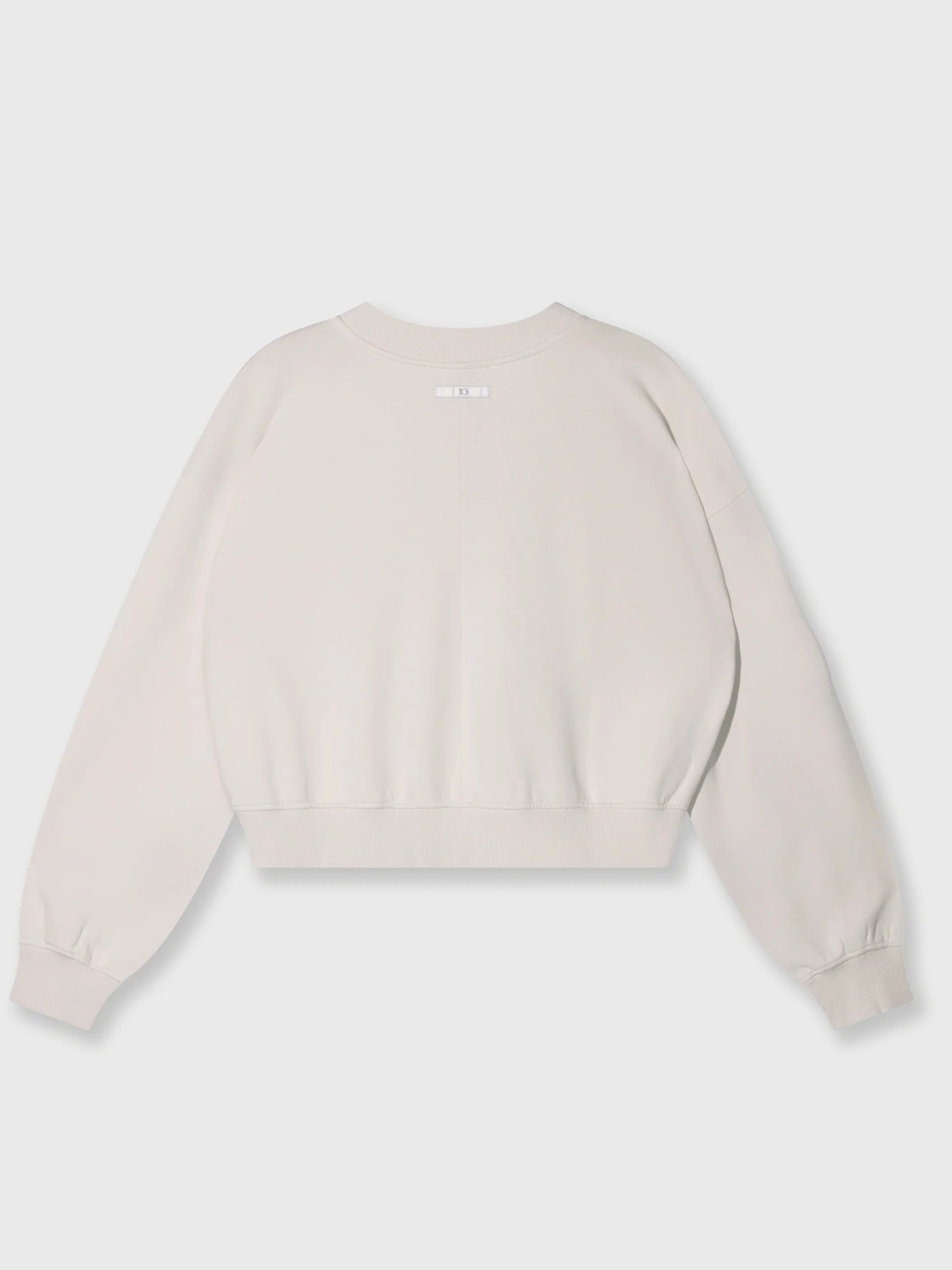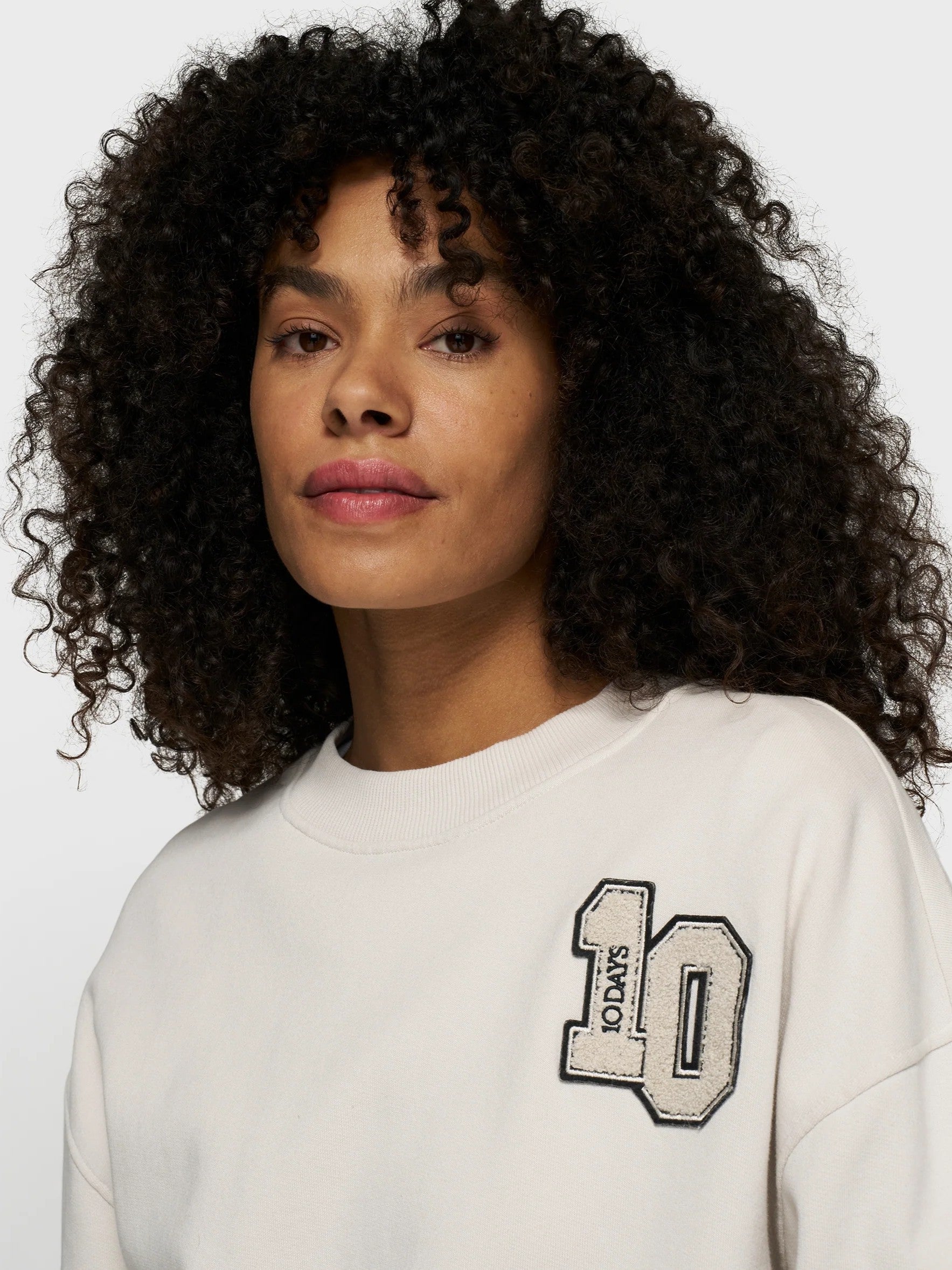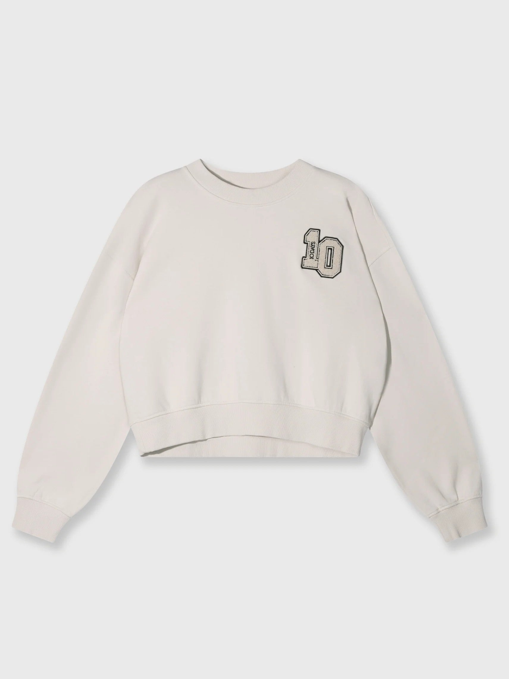 Relaxed Fit Cropped Sweater aus Fleece aus GOTS-zertifizierter Bio-Baumwolle. Mit Strickbündchen, einem Satinlabel auf dem Rücken und einem mittelgroßen „10“-Aufnäher auf der linken Brust.