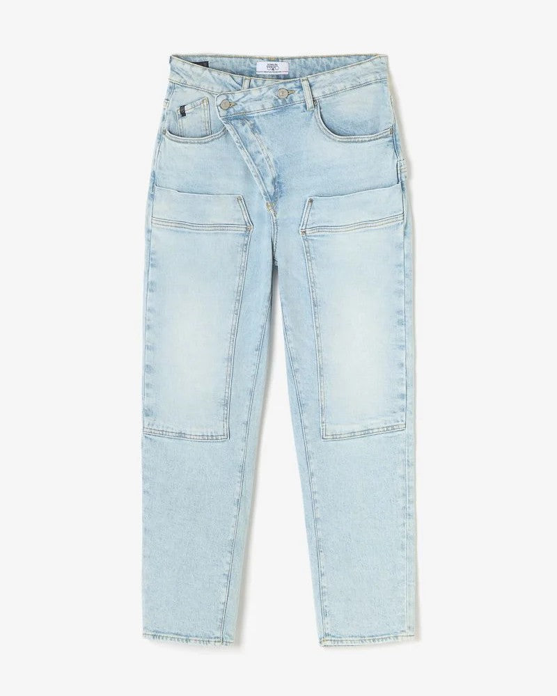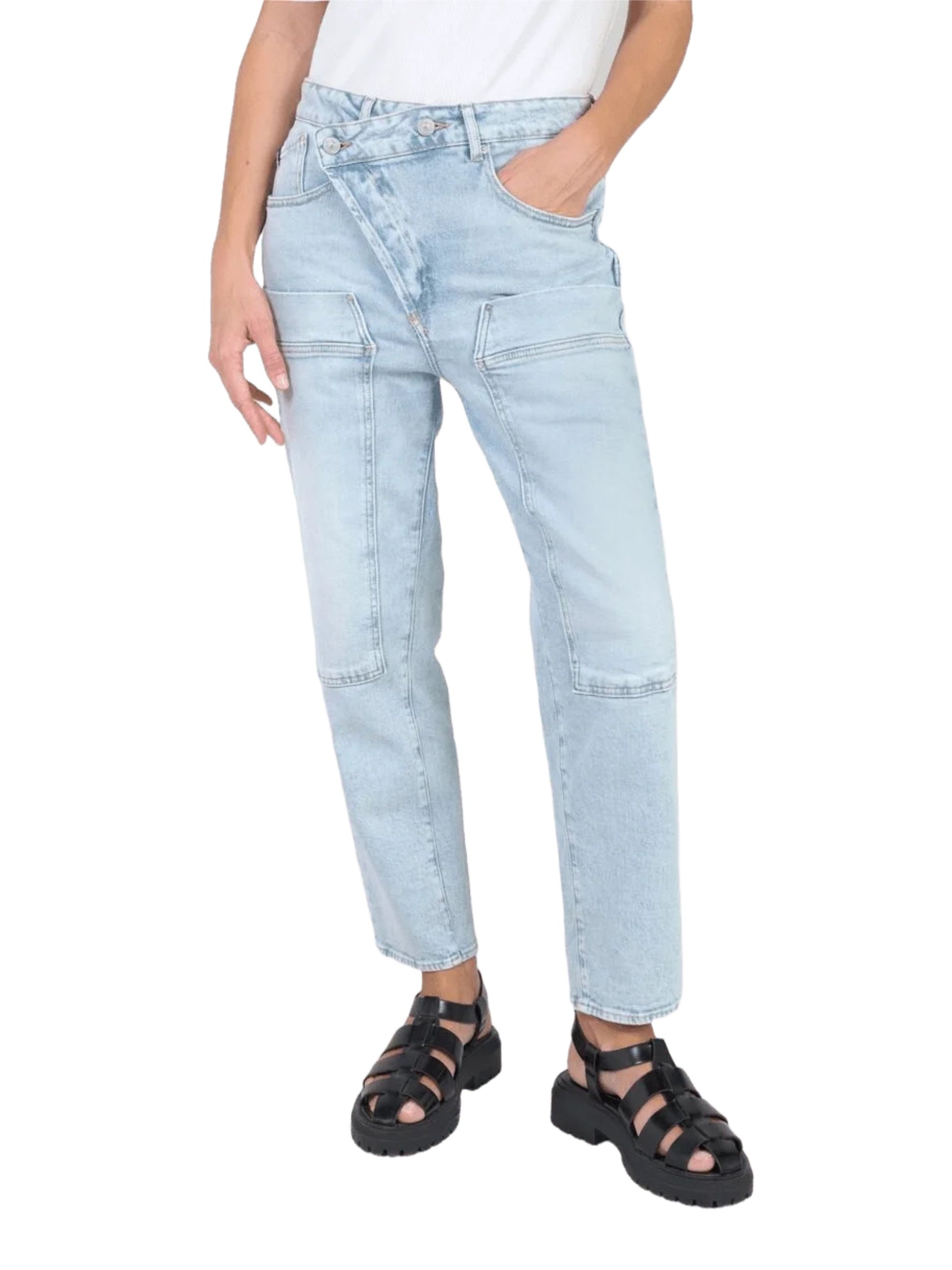 Jeans mit asymmetrischen Bund, mit Knopfverschluss und langen aufgesetzten Taschen.