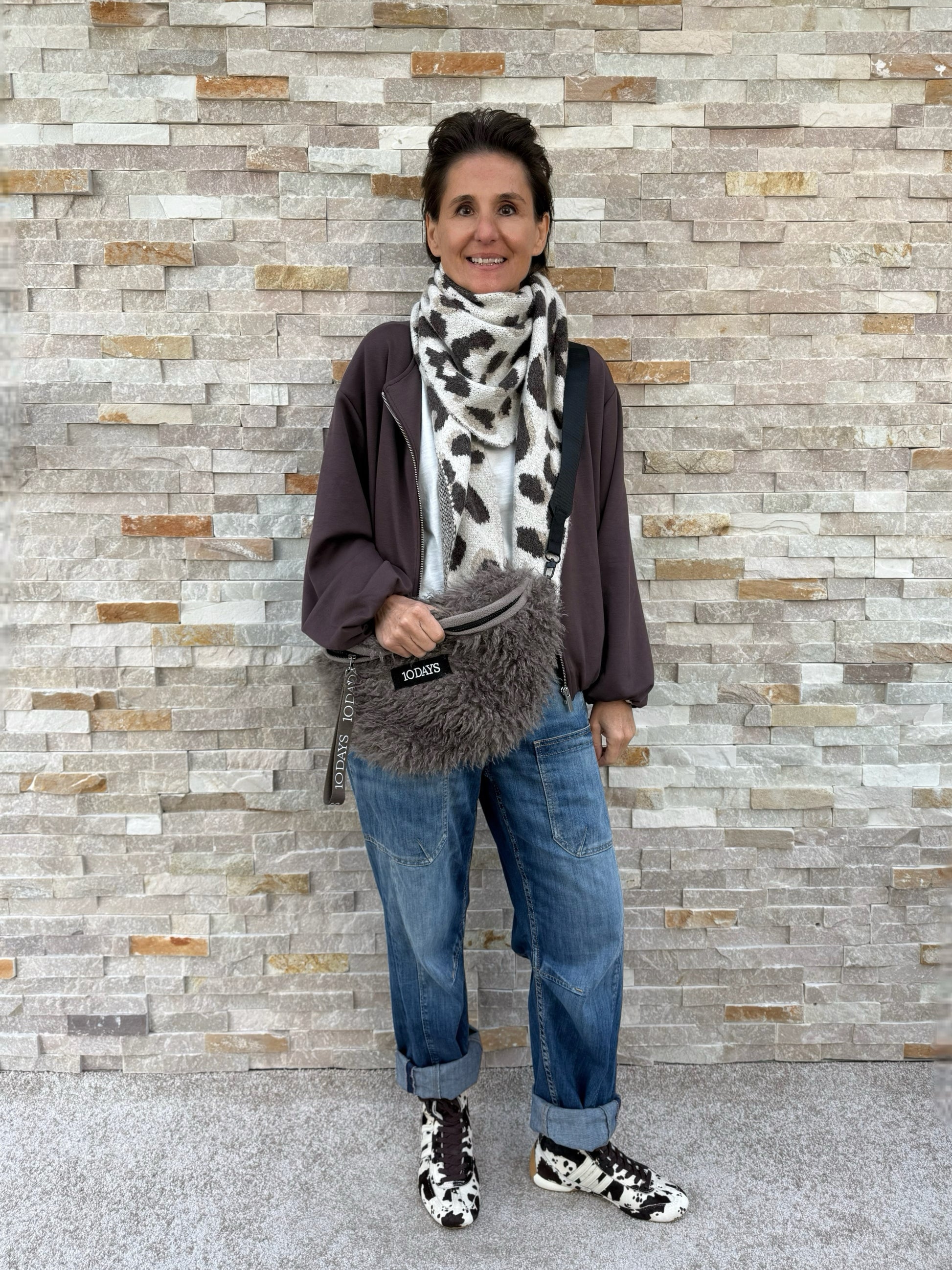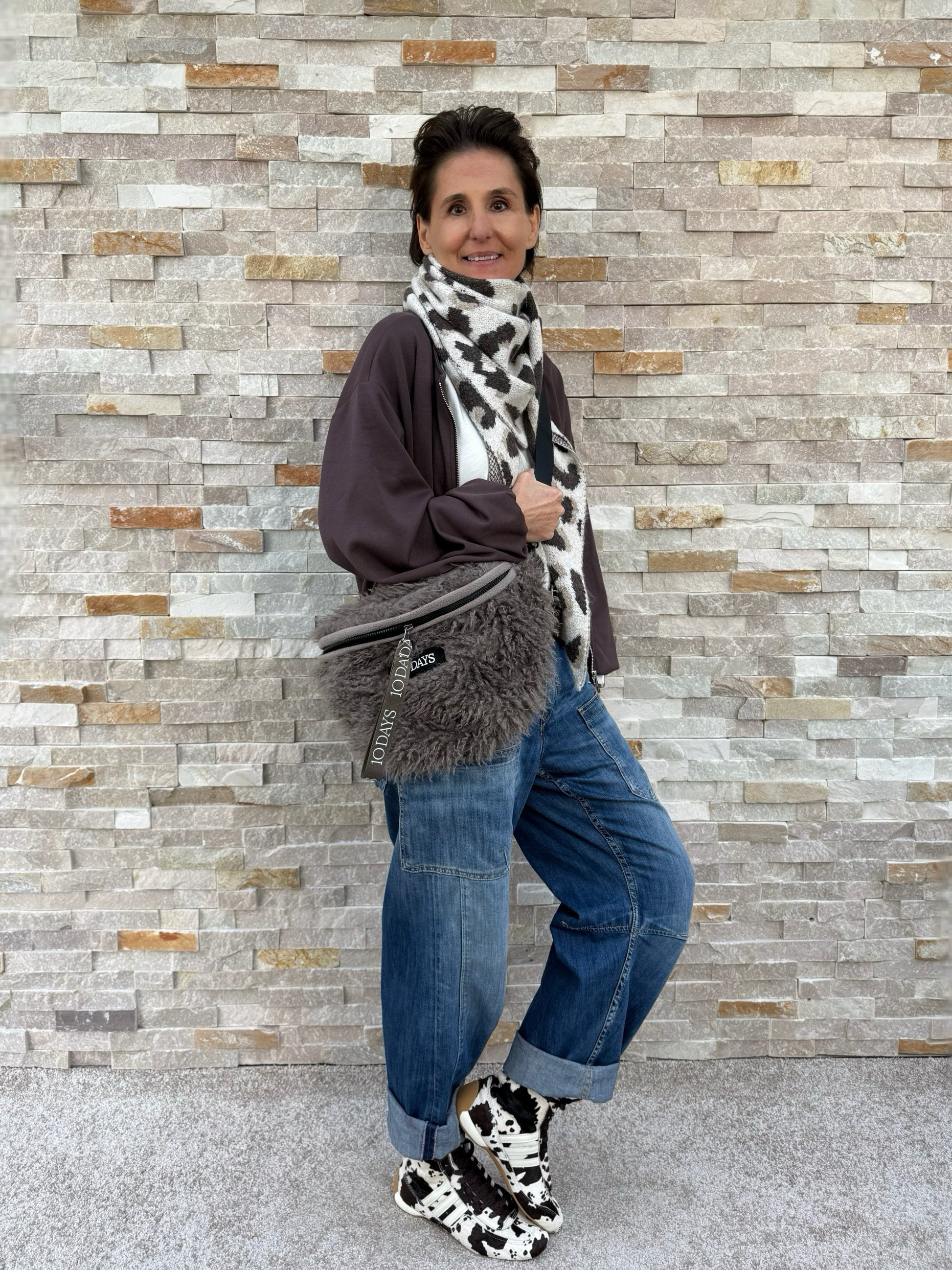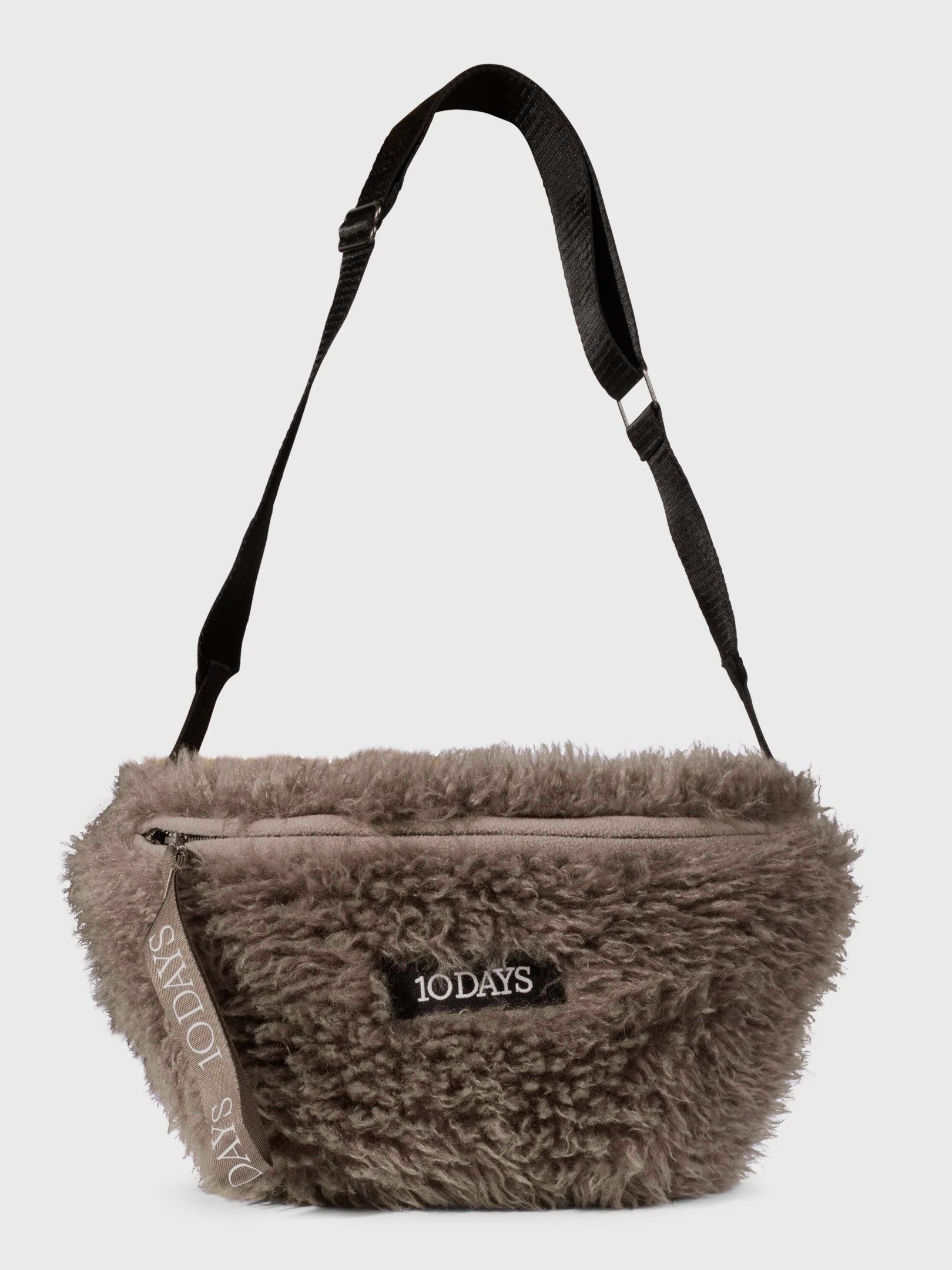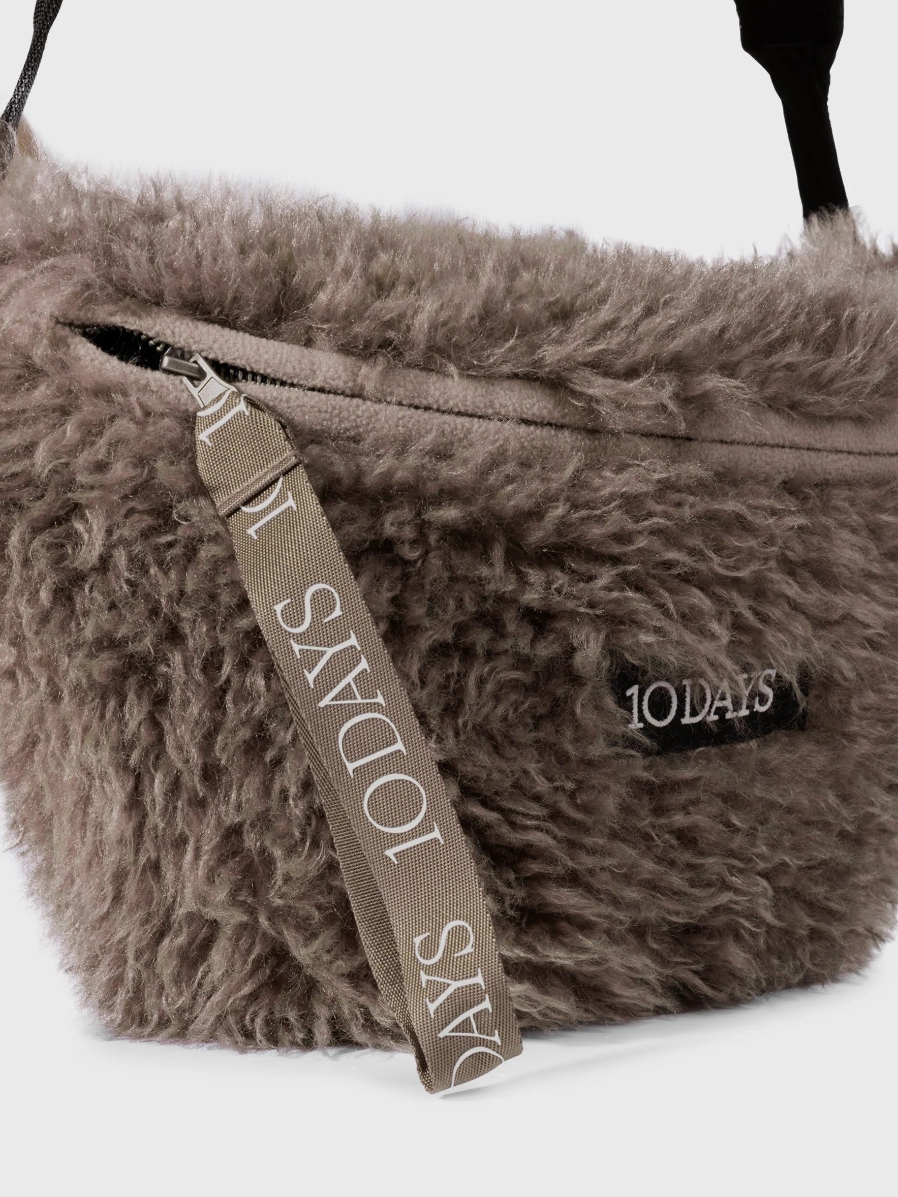 Pelz-Crossbody-Tasche aus weichem Fleece-Fell. Mit einem verstellbaren Band und Schnallenverschluss, Reißverschluss, einer Gesäßtasche mit Reißverschluss, einem „10DAYS“-Logo-Reißverschlussanhänger, einer Innentasche sowie einem „10DAYS“-Label an der Vorderseite.