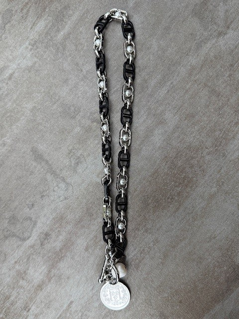 Kurze Halskette aus schwarzen und silberfarbenen Gliedern. Zwischen den silbernen Gliedern sind weiße Perlen eingearbeitet. Eine Silbermünze als Anhänger.
