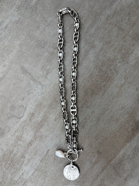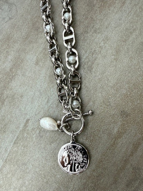 Halskette COIN mit Perlen und Münzanhänger Silber
