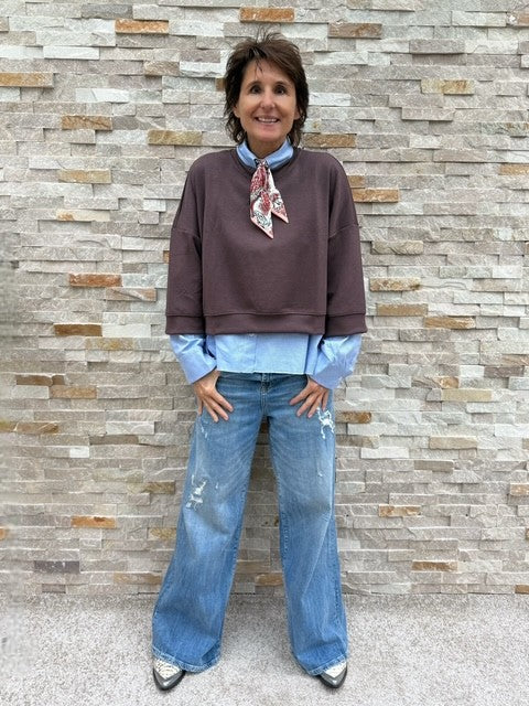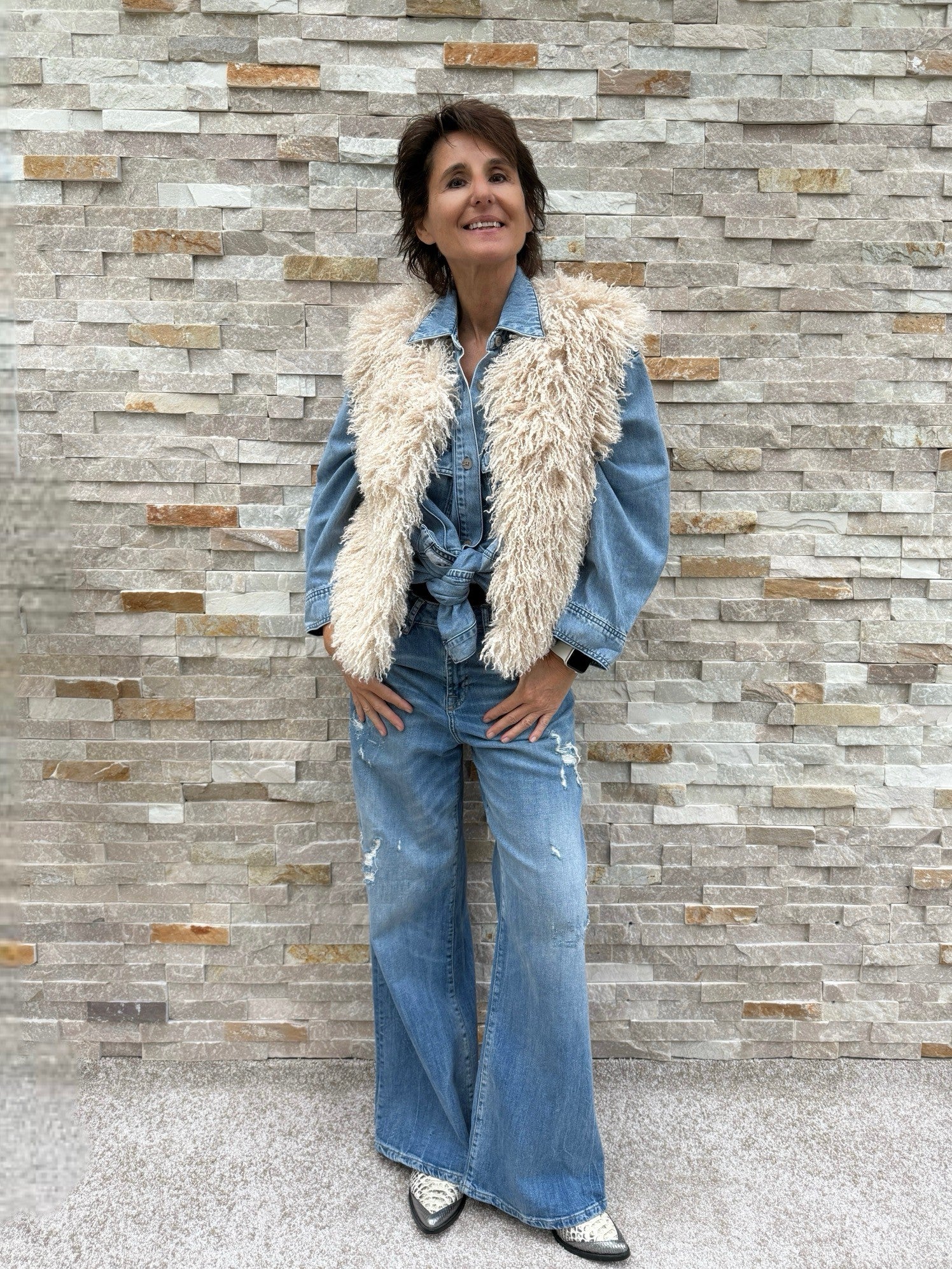 Wide Leg 5-Pocket Jeans. Die Jeans soll hoch in der Taille sitzen. Mittelblaue Waschnung mit leichten destroyed Elementen. Sehr weites Bein mit normaler Länge.