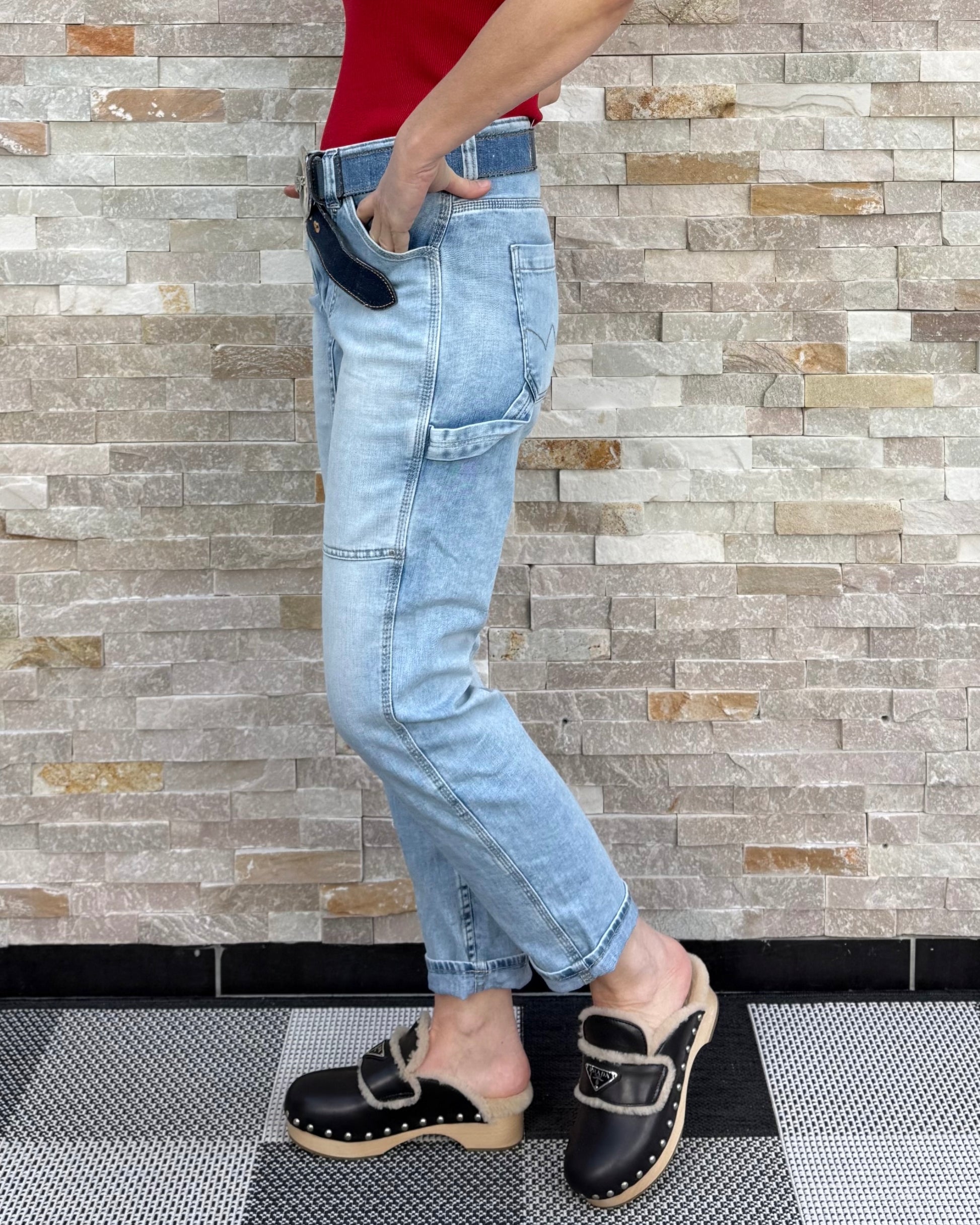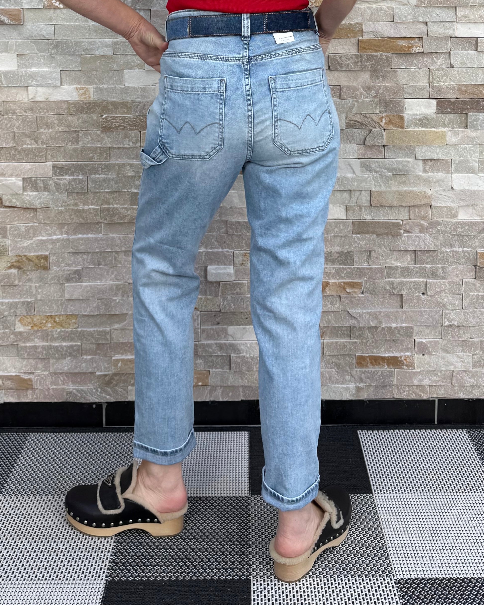 High Waist Jeans knöchellang mit aufgesetzten Taschen.