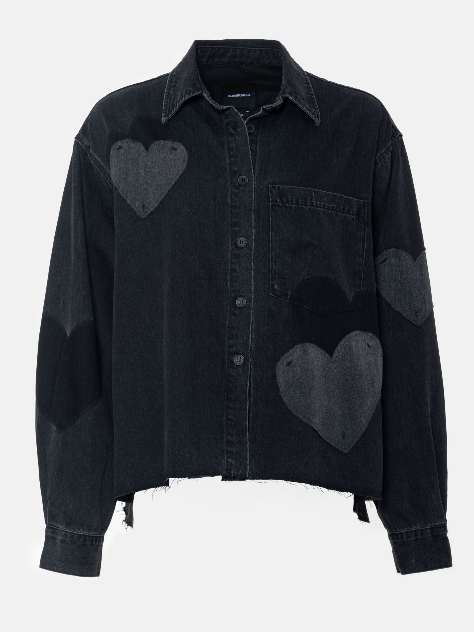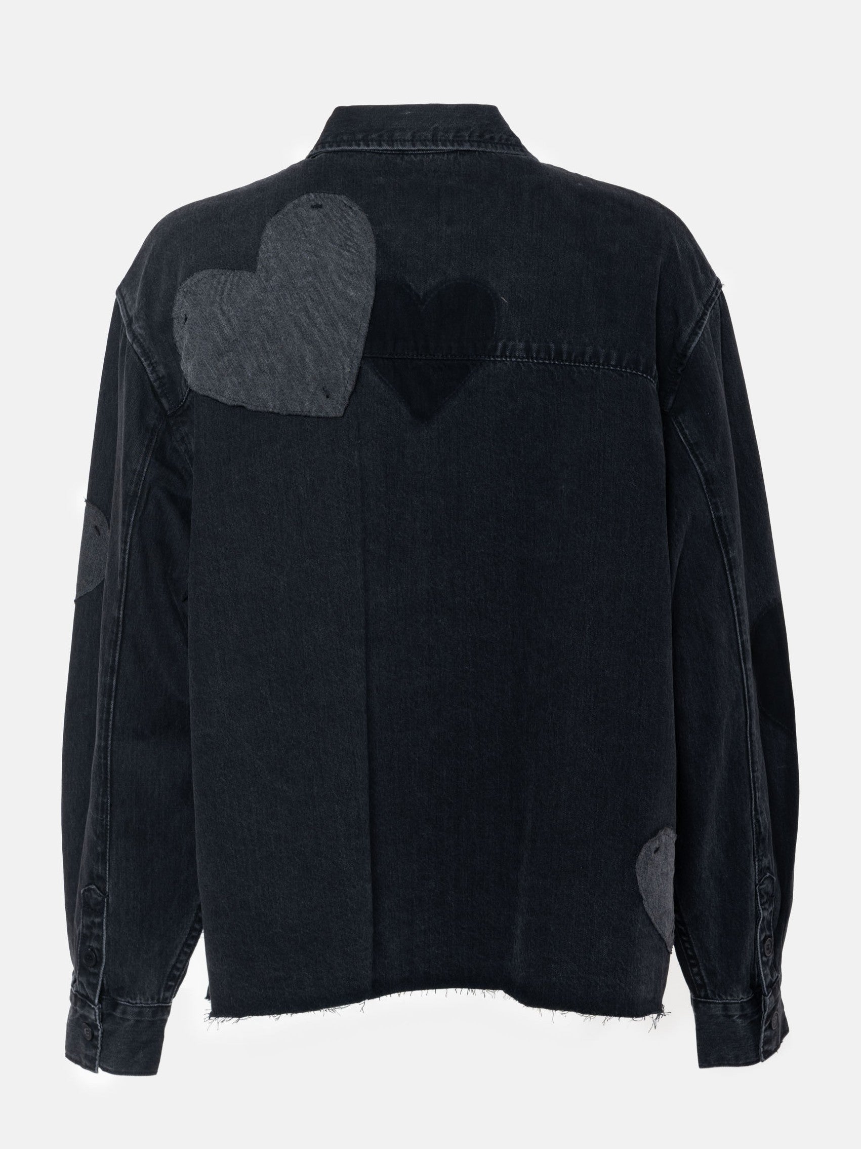 Lässig, weites Jeanshemd in einer verkürzten Form. Mit Herz-Applikationen in Kontrast-Denim, aufgesetzte Brusttasche. Offener, ausgefranster Saum und überlange Ärmel!