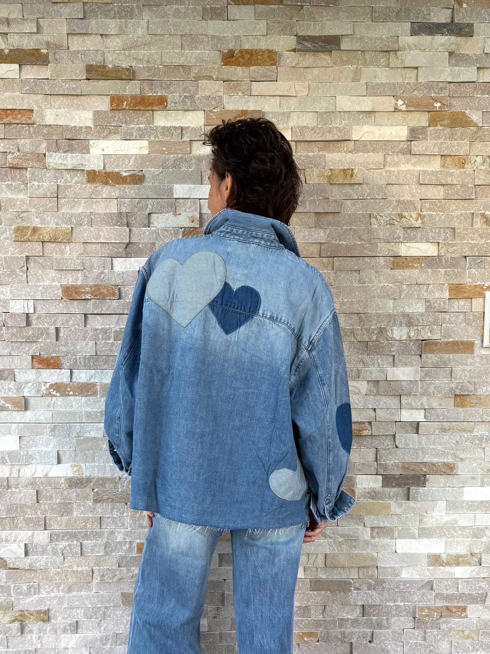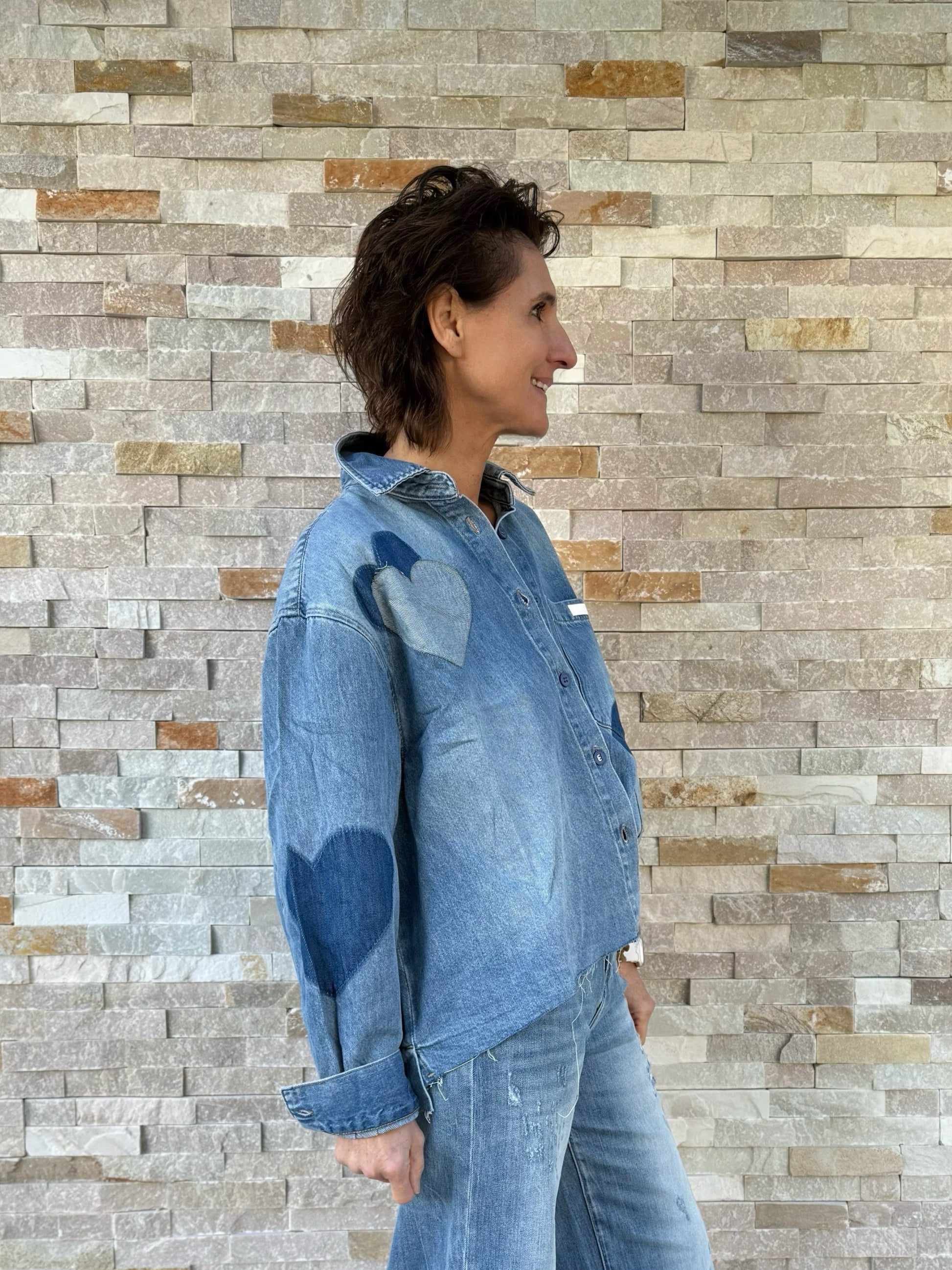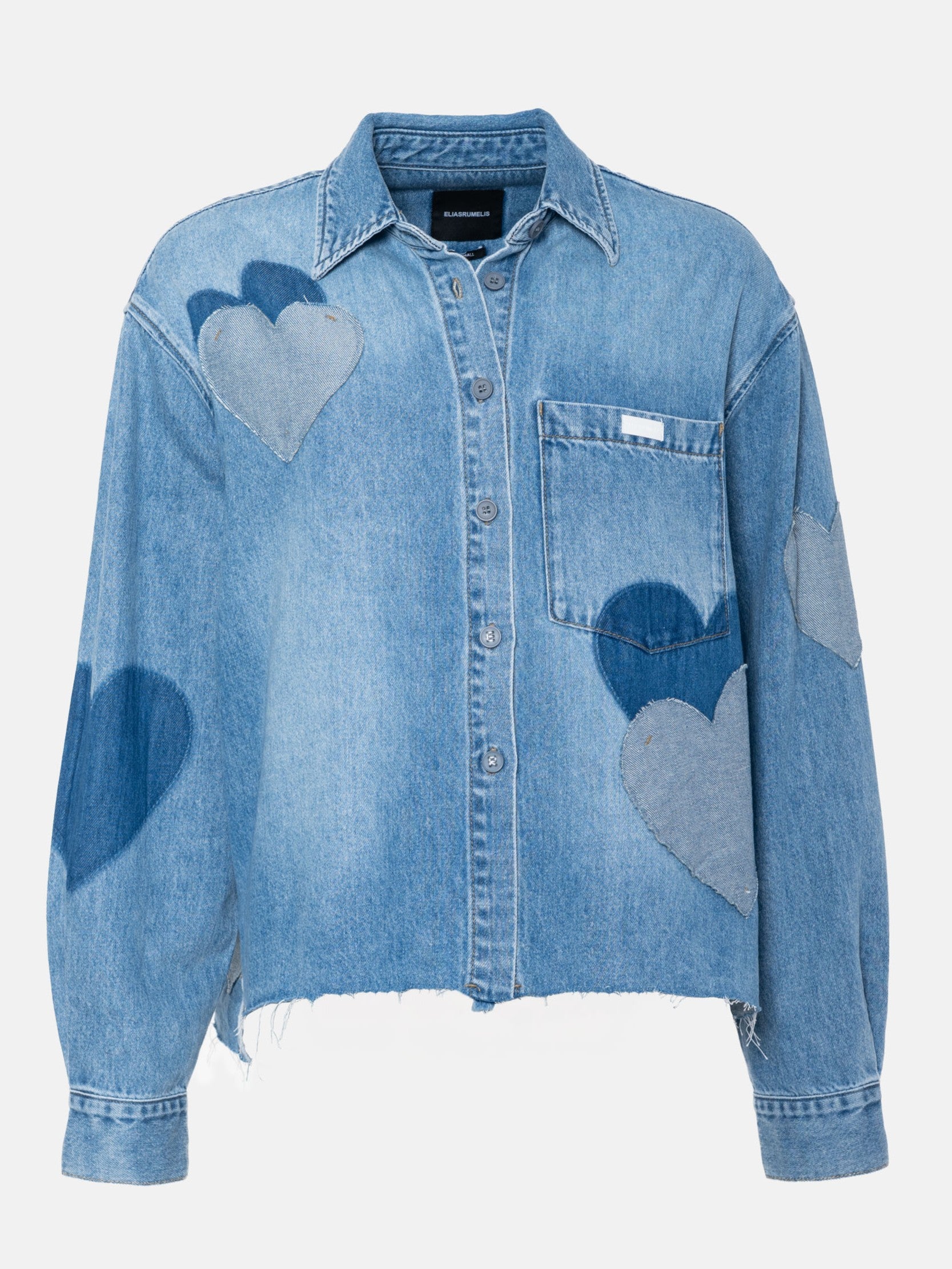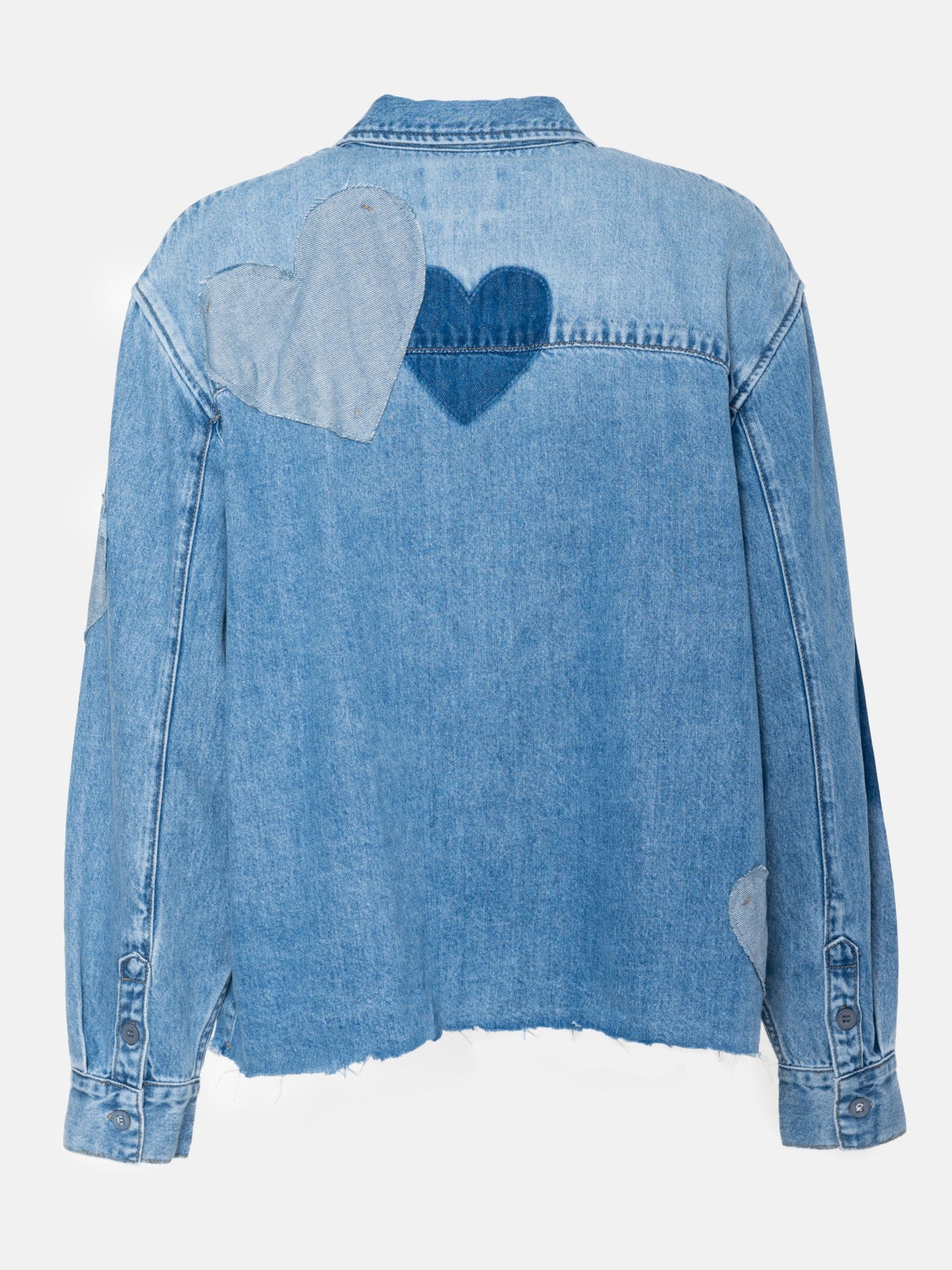 Lässig, weites Jeanshemd in einer verkürzten Form. Mit Herz-Applikationen in Kontrast-Denim, aufgesetzte Brusttasche. Offener, ausgefranster Saum und überlange Ärmel!