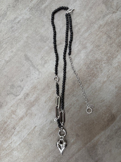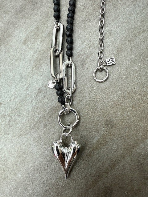 Kette mit silbernen Gliedern und Lava Perlen Herz-Anhänger Silber-Schwarz