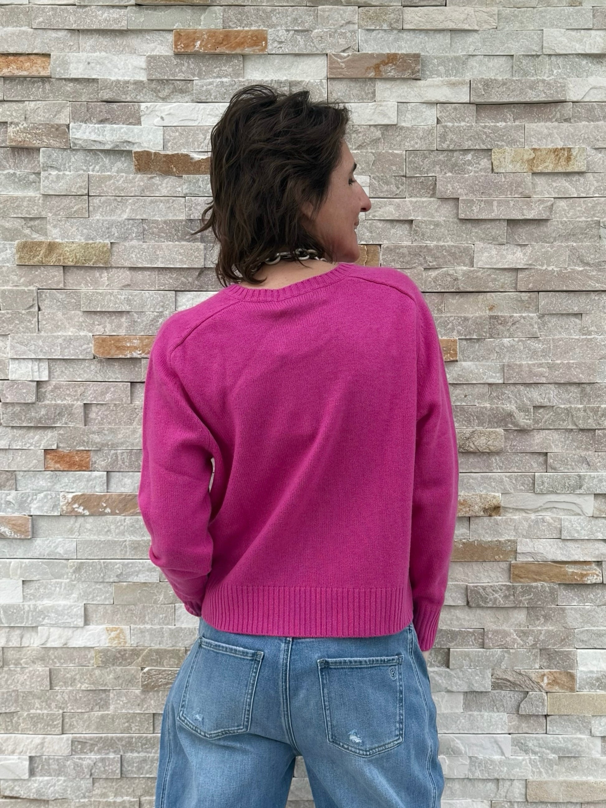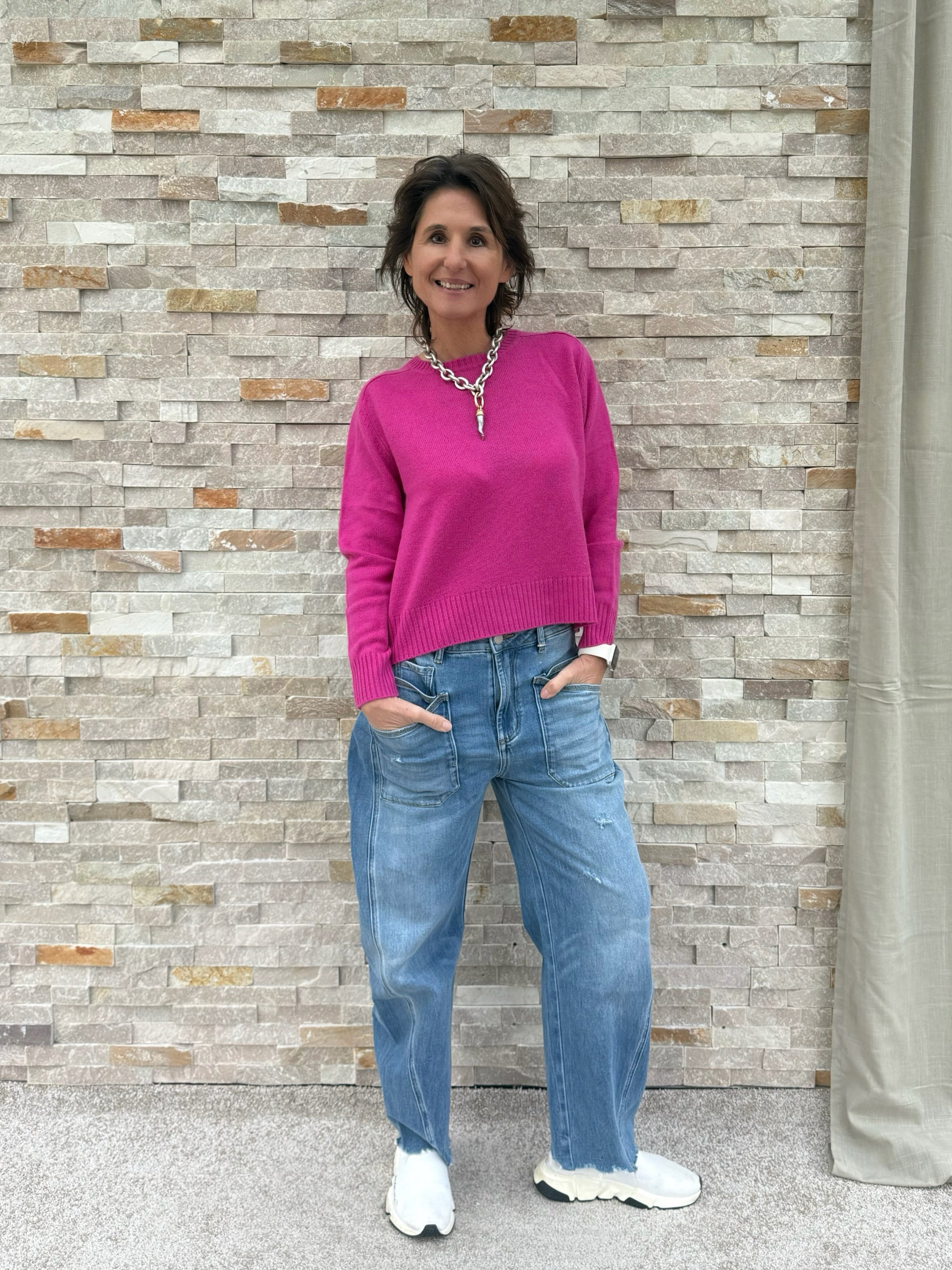 Kleinerer Kaschmir Pullover mit Rippenbündchen in einer etwas kürzeren Form. Toll zu weiten Hosen oder Röcken.