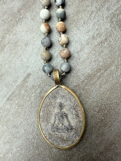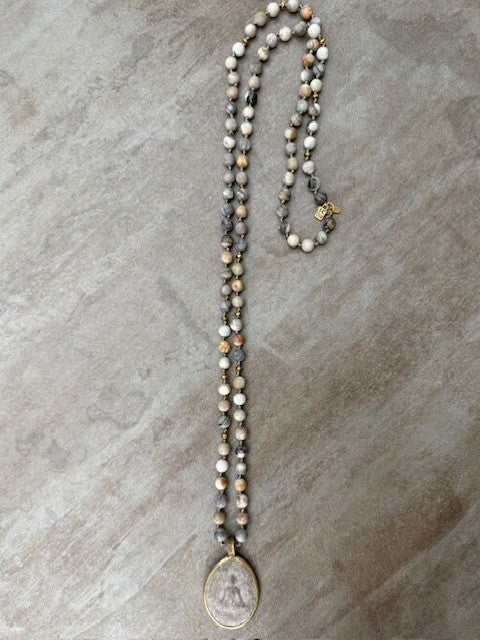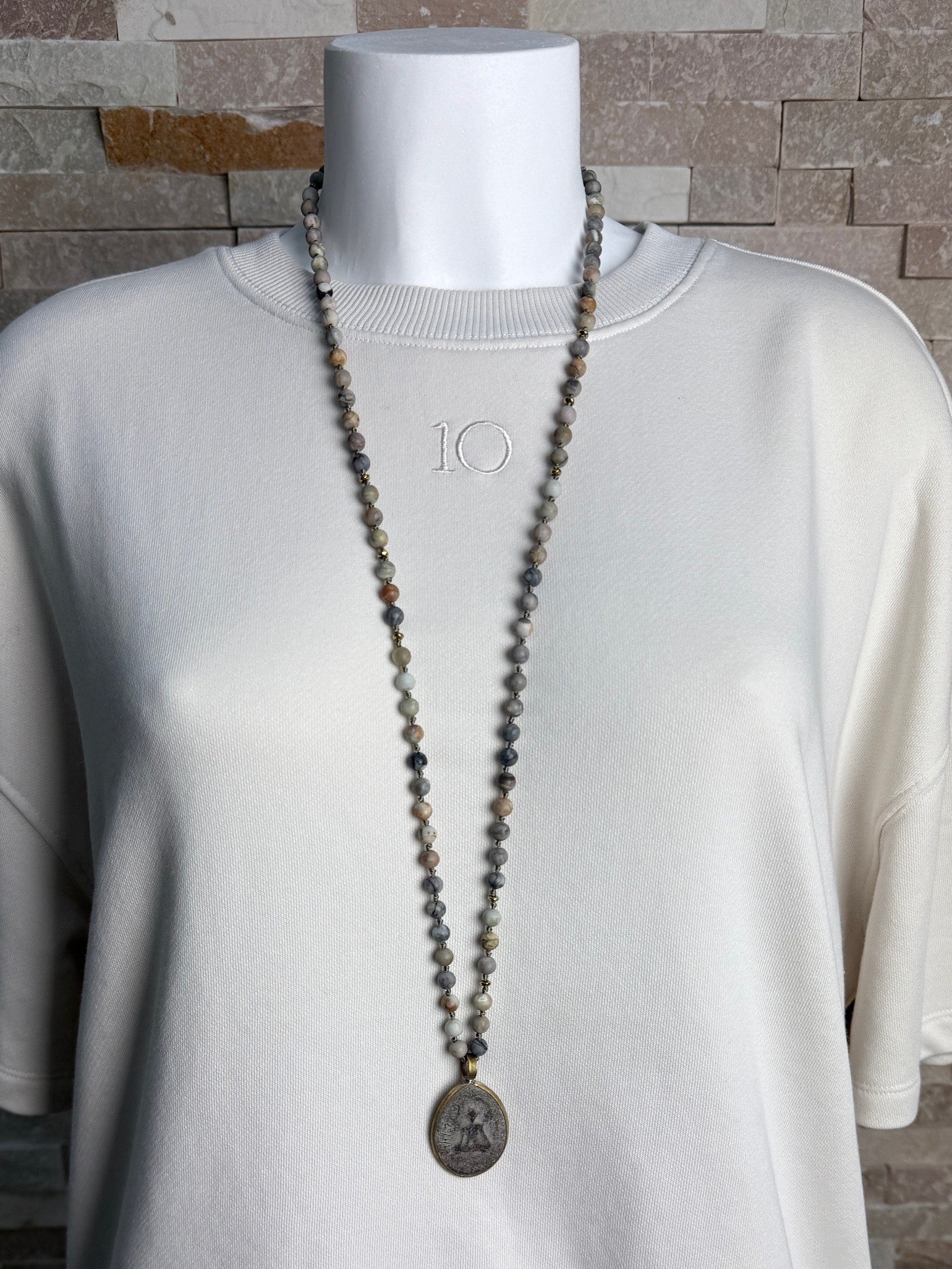 Lange Kette Buddha 22 mit Natursteinen in Grau, Beige, Braun mit Baddha Anhänger in Gold eingefasst.