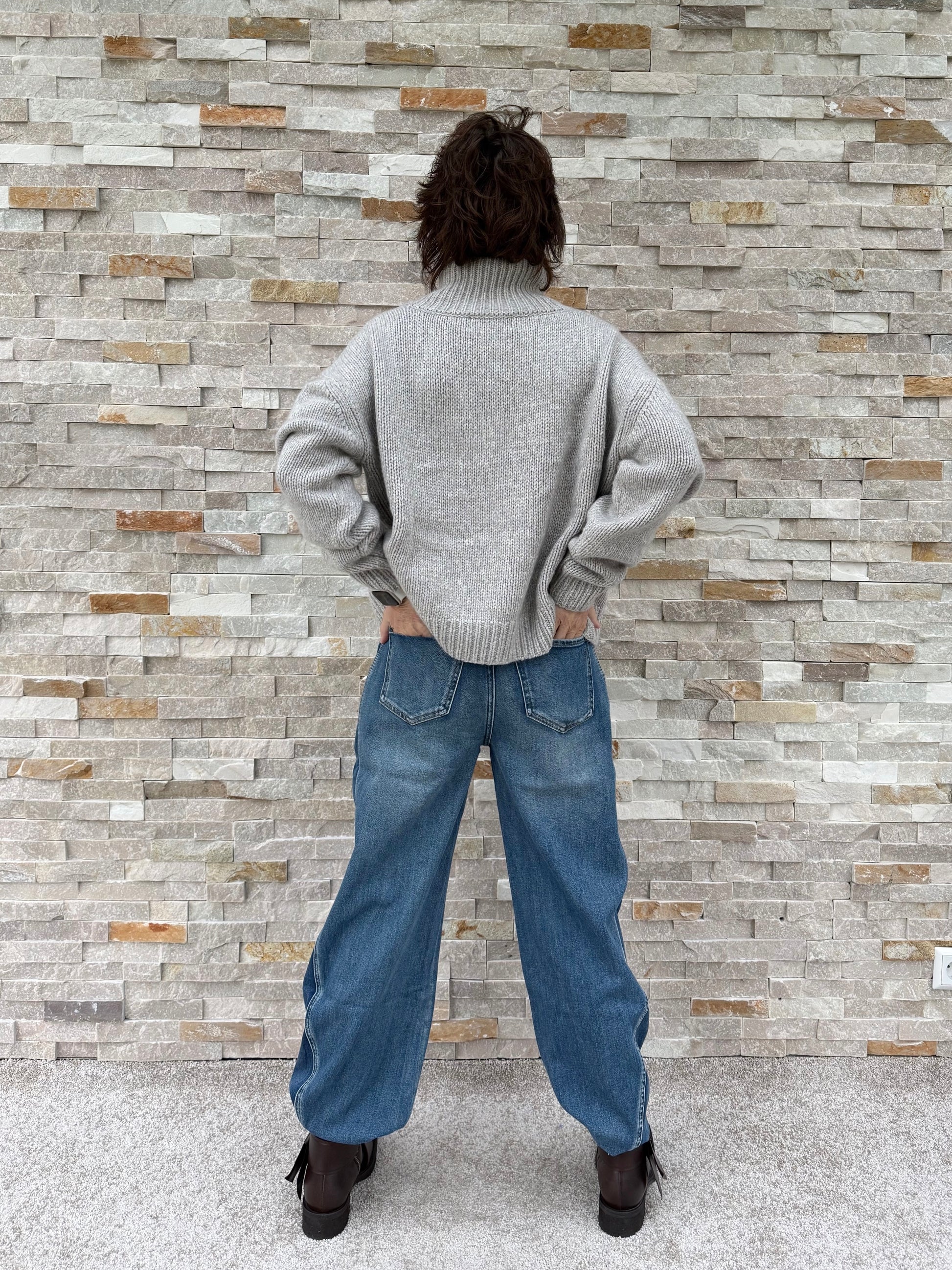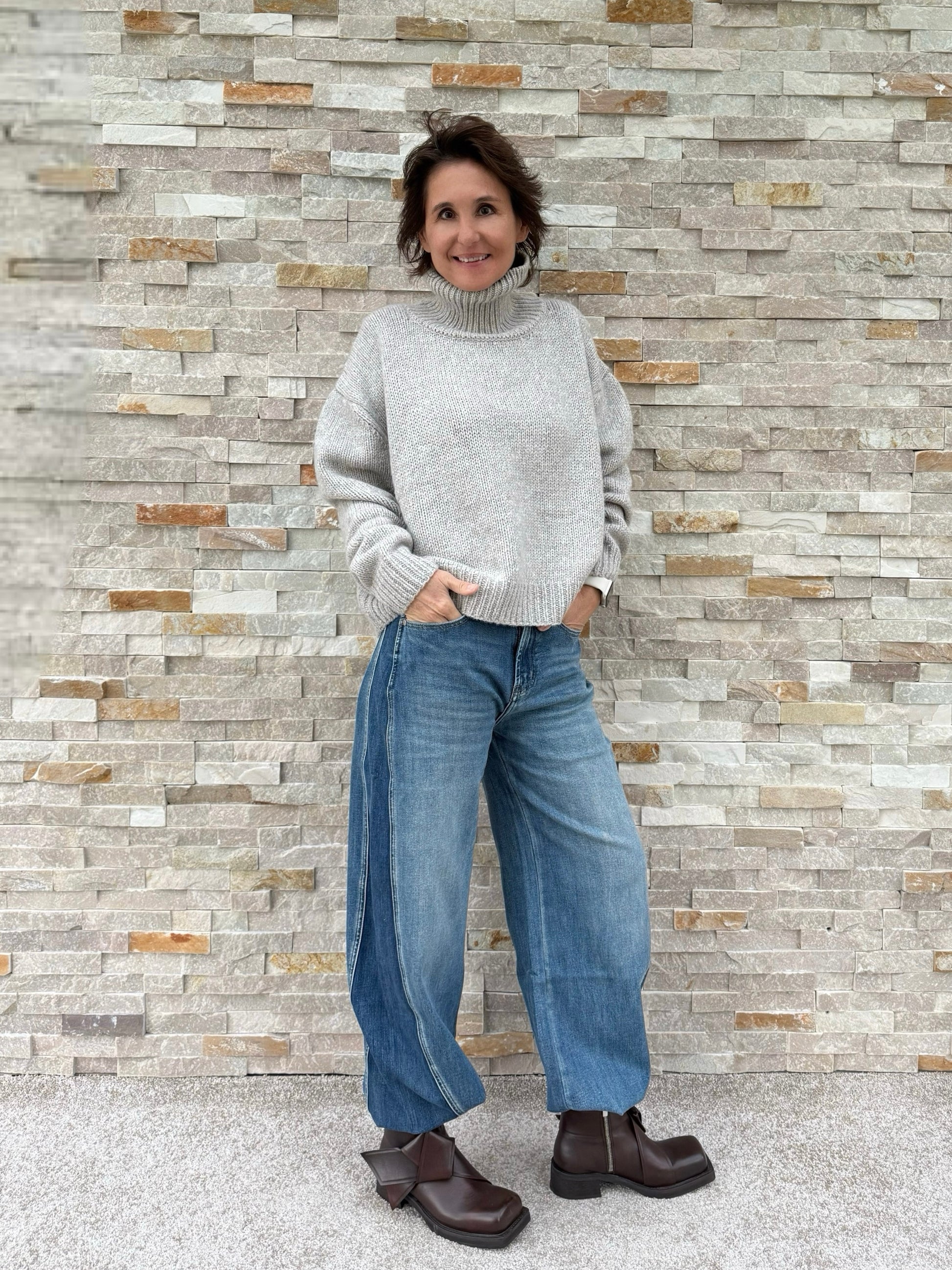 Knöchellange Jeans mit Reißverschluss, ausgefranstem Saum und einer modernen Barrel Form. Der seitliche Einsatz ist aus einem dunkleren Denim.