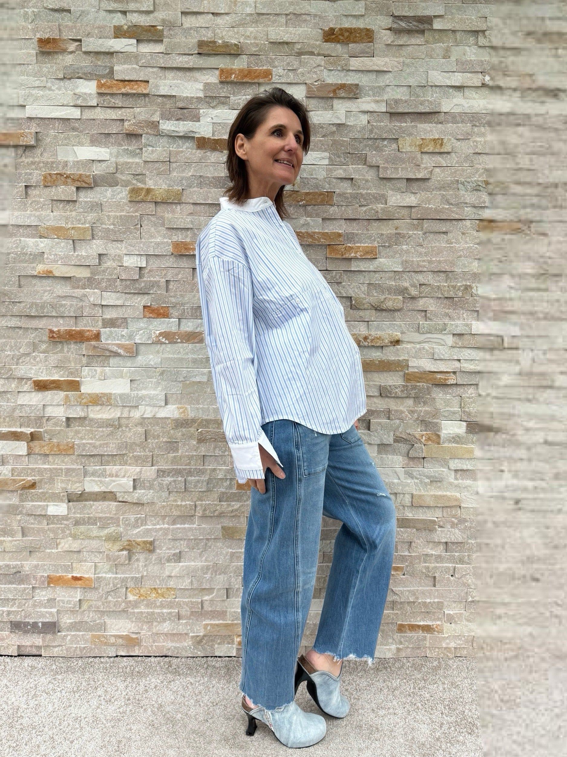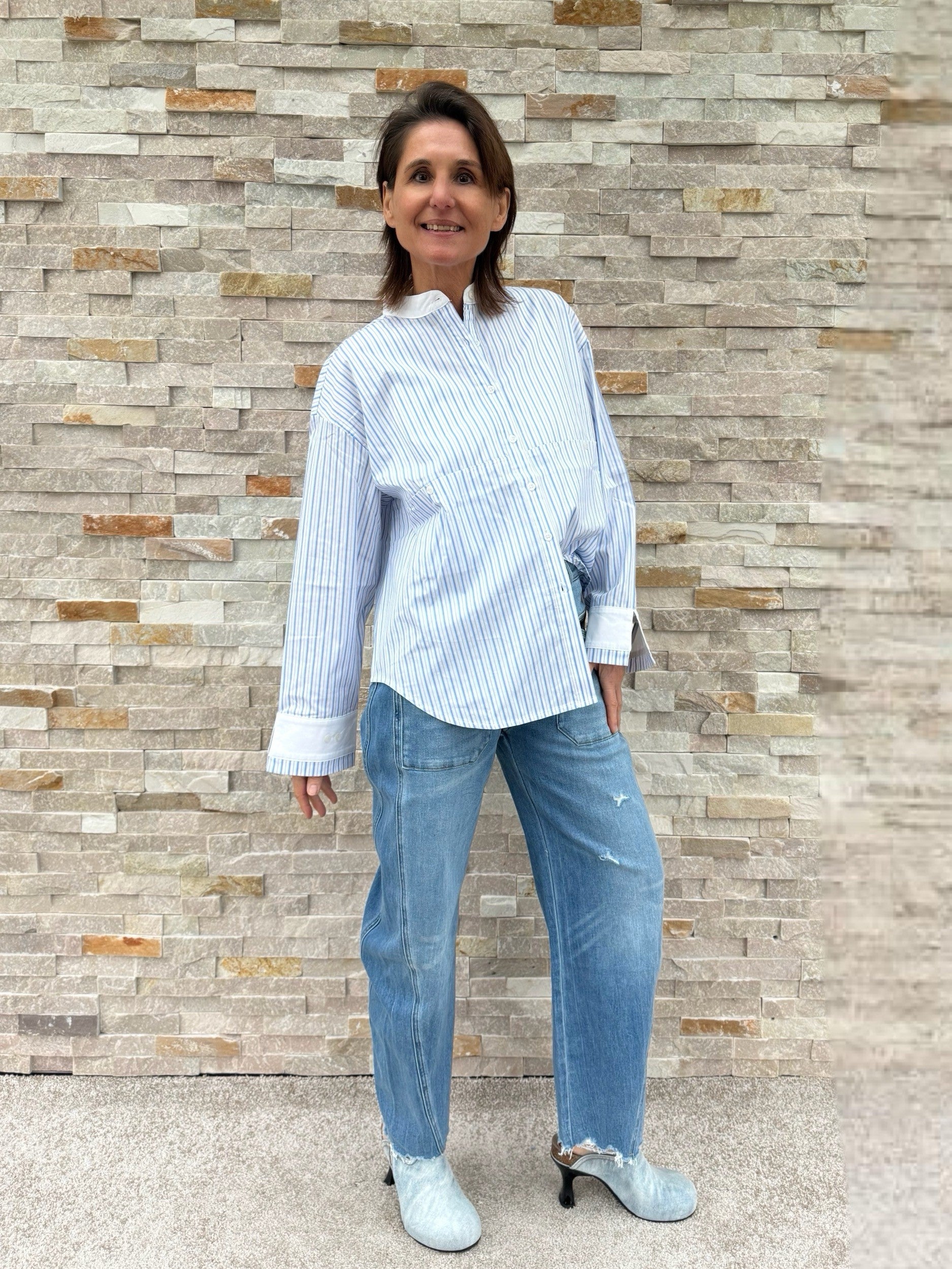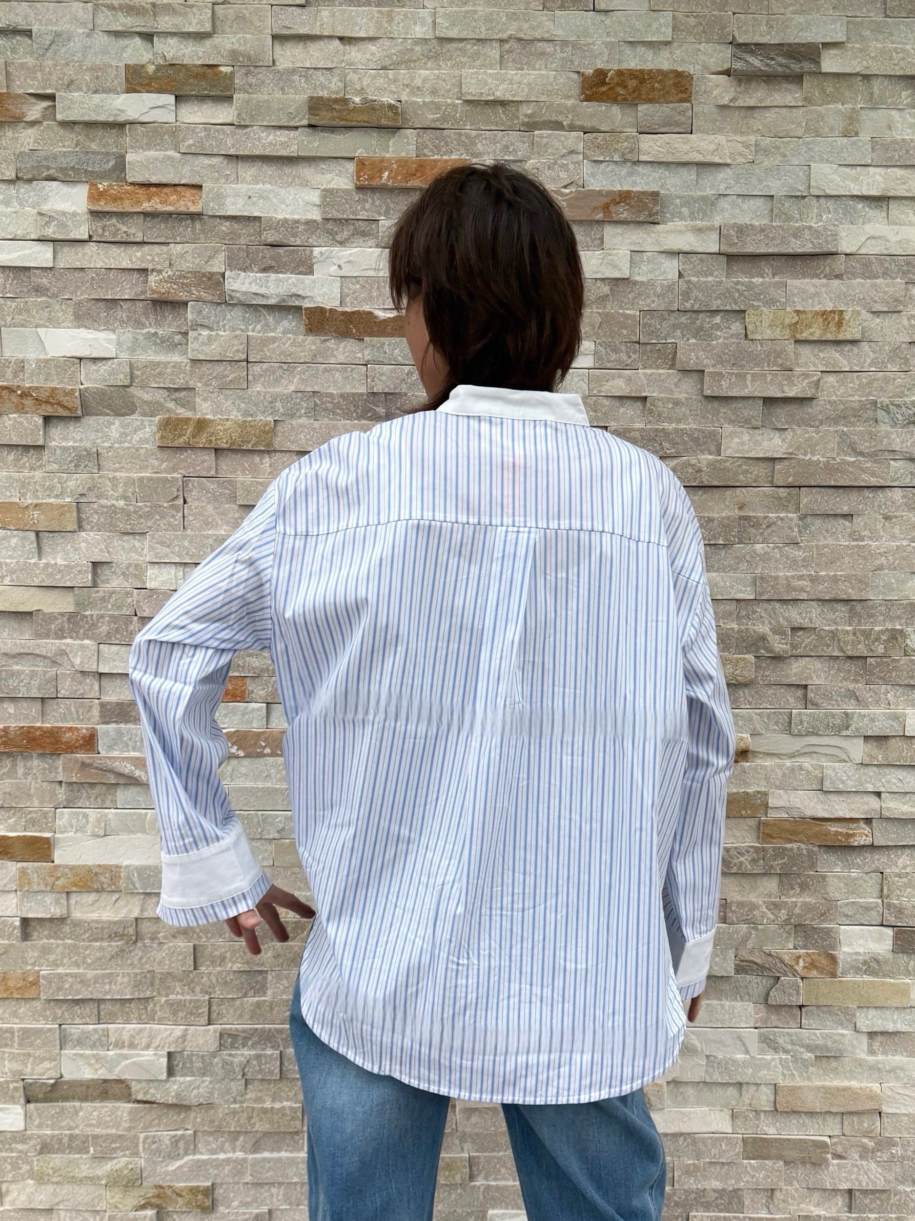 Oversized Streifen Bluse mit Stehkragen in Weiß mit Hellblau
