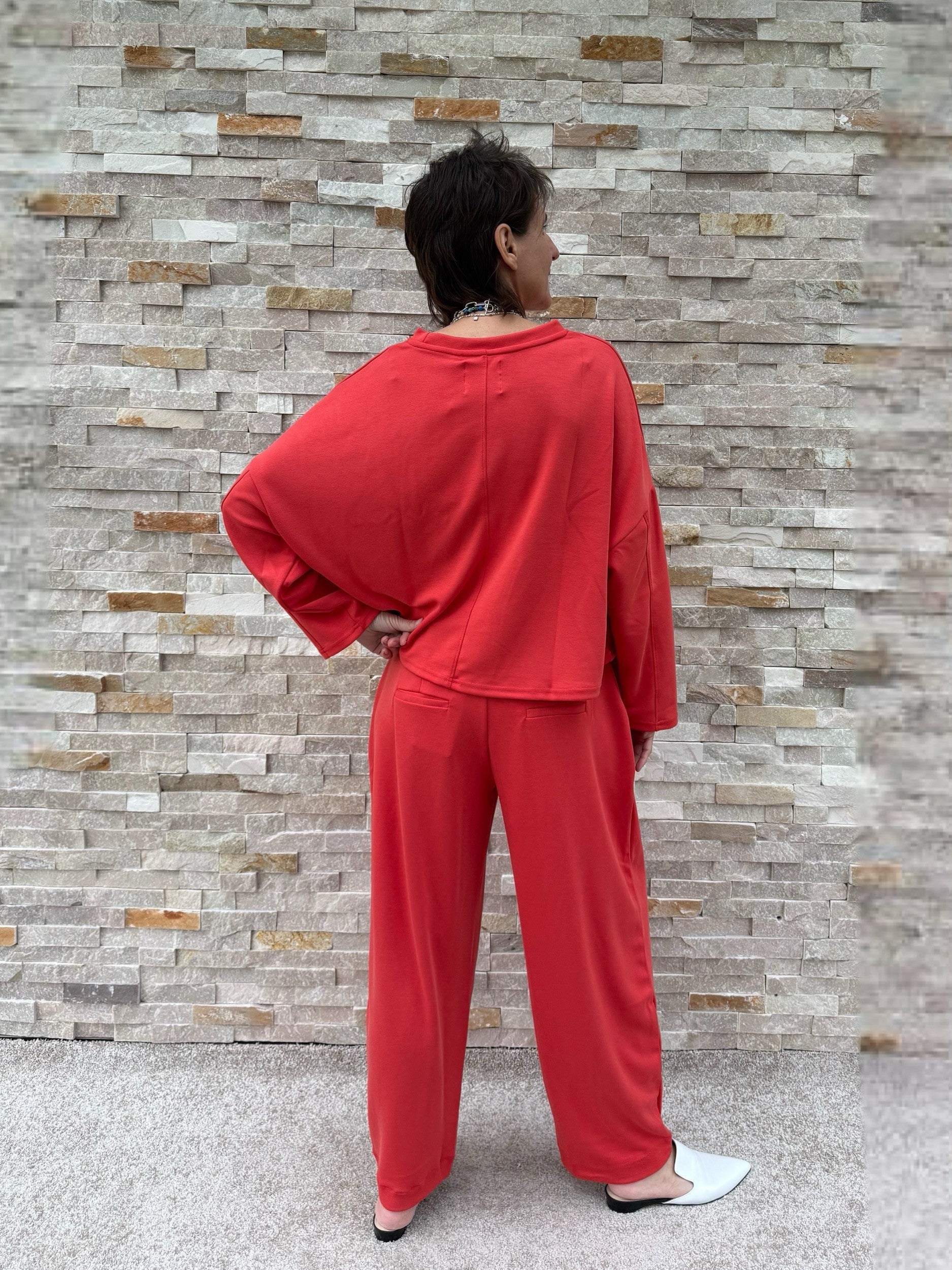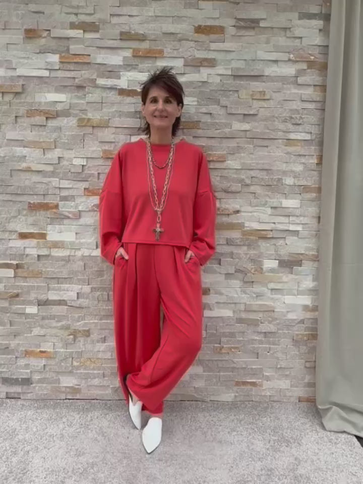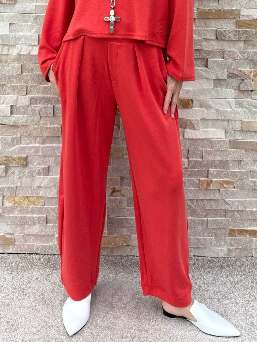 - Breiter Gummibund, Bundfalten, seitliche Eingriffstaschen