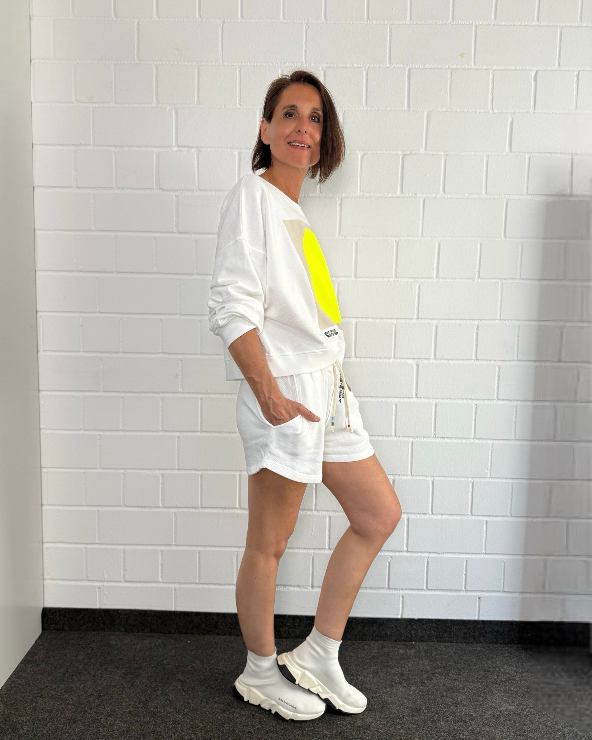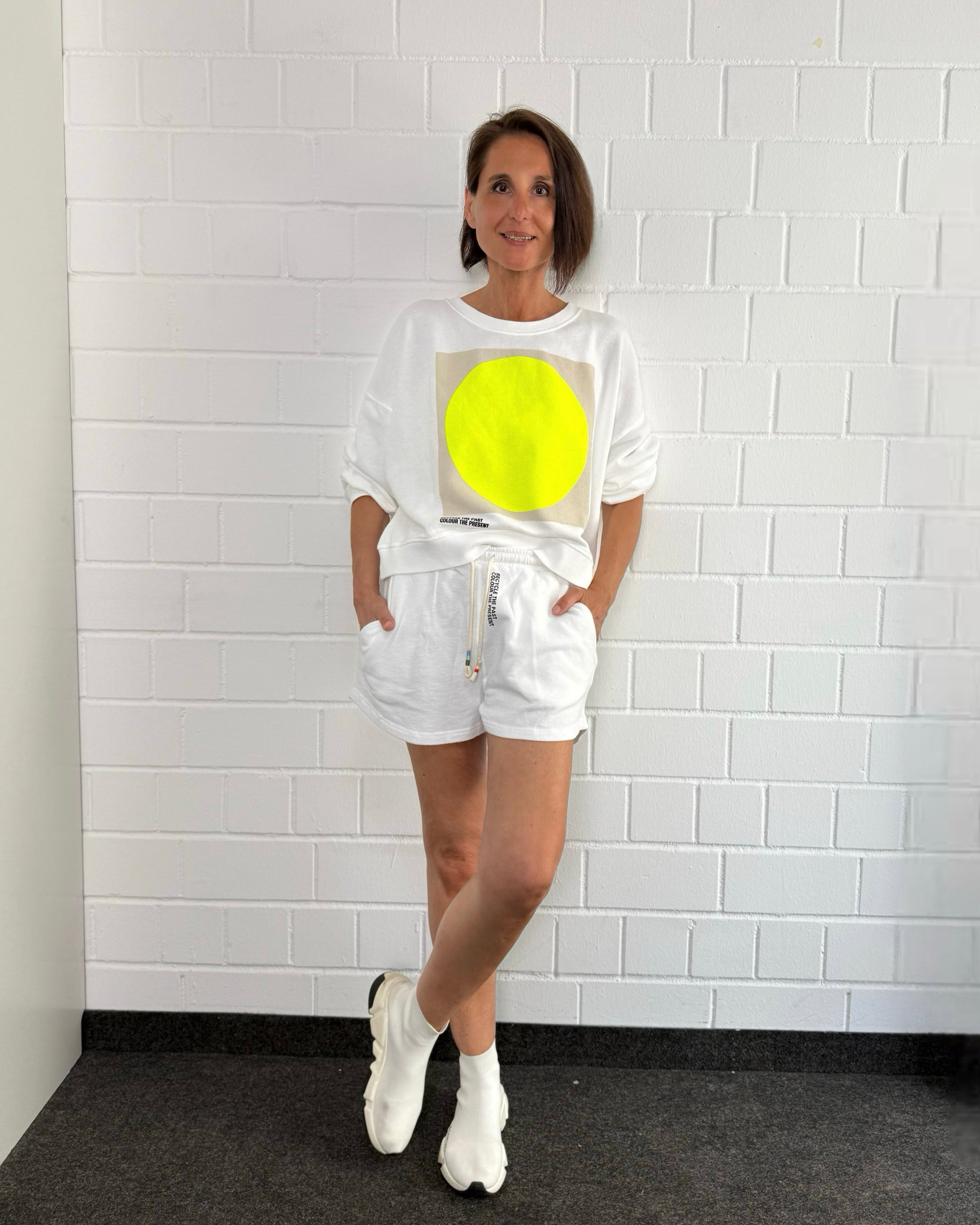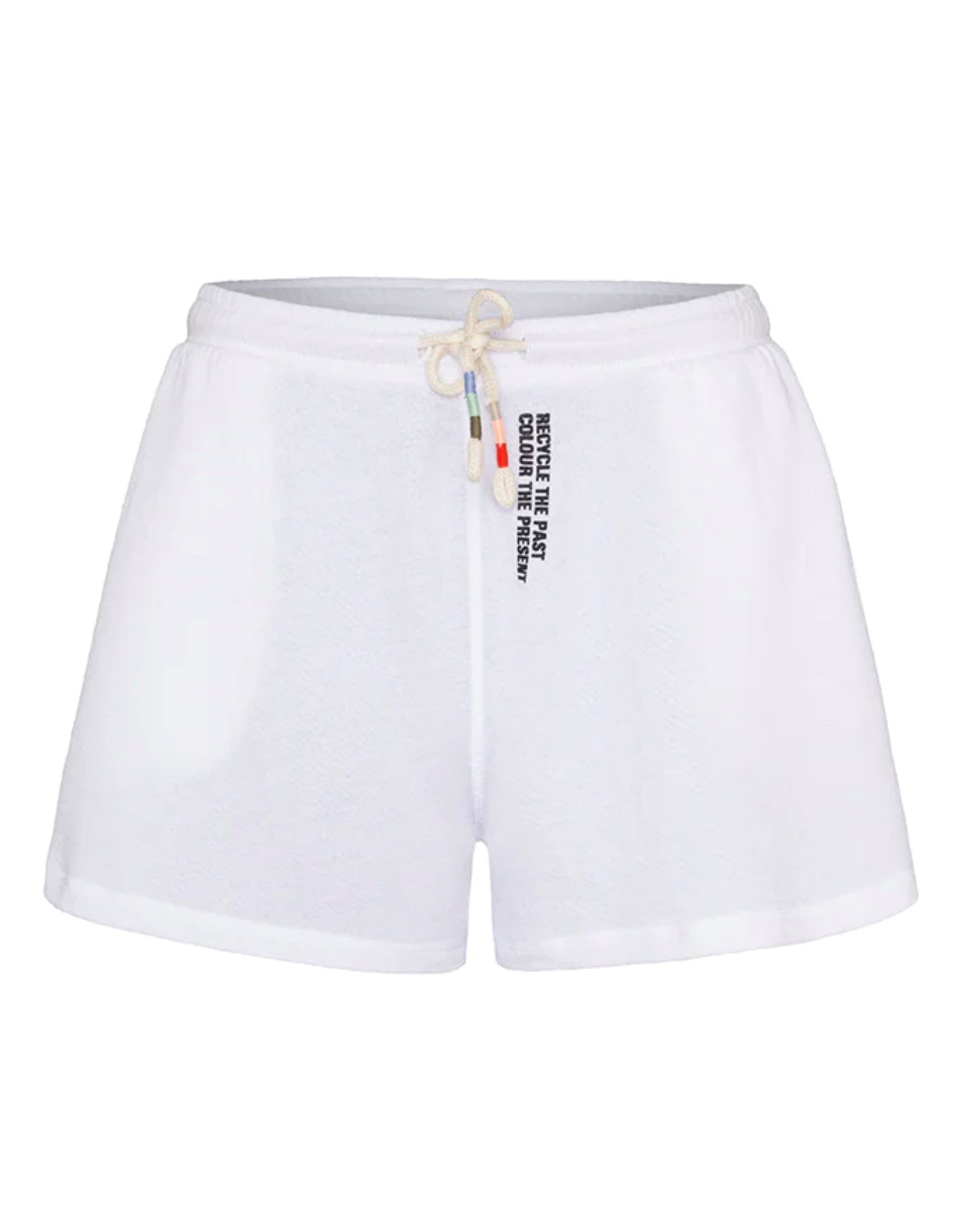 Sweat-Shorts mit buntem Garn umwickelten Kordeln. Der Aufdruck „Recycle the past, color the present“ ist auf innovative Weise positioniert.