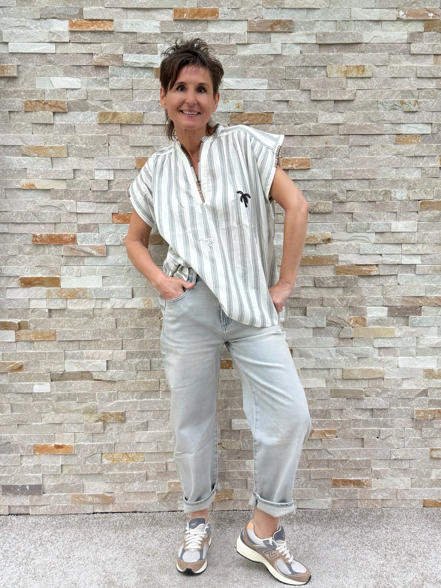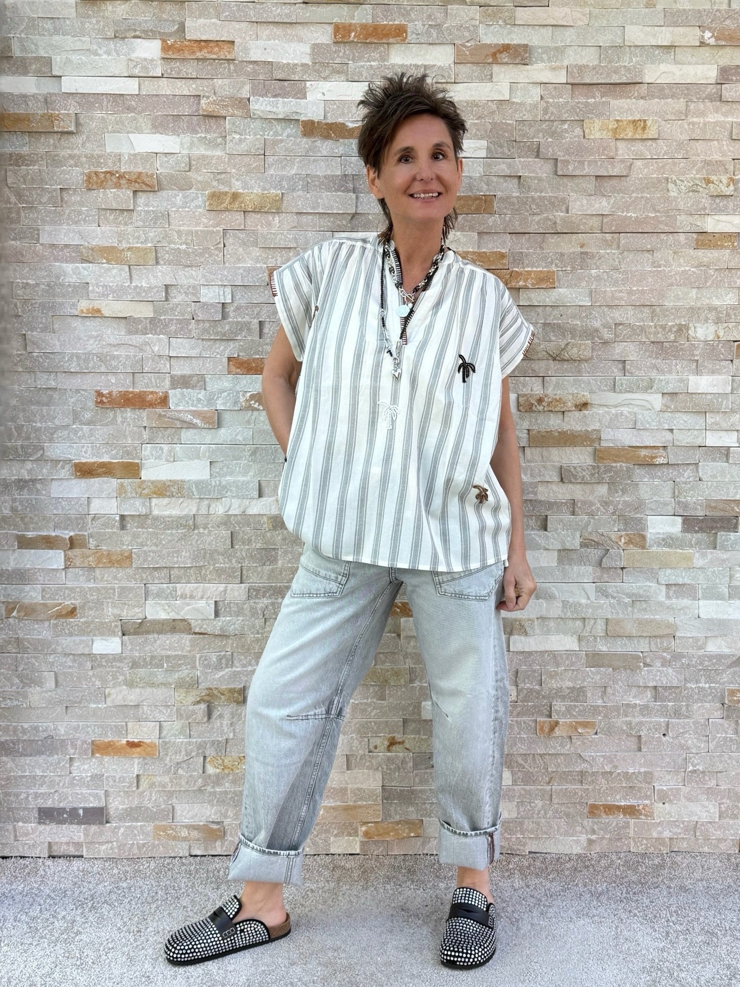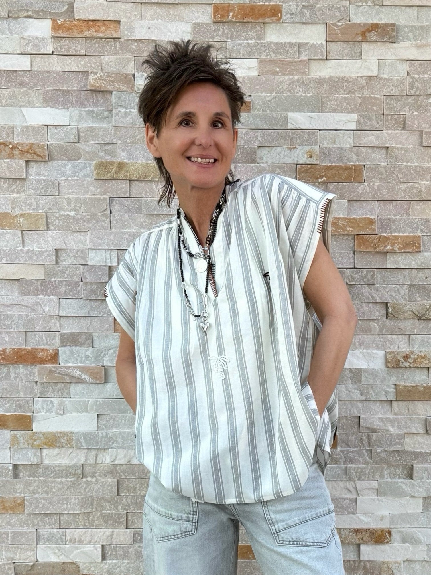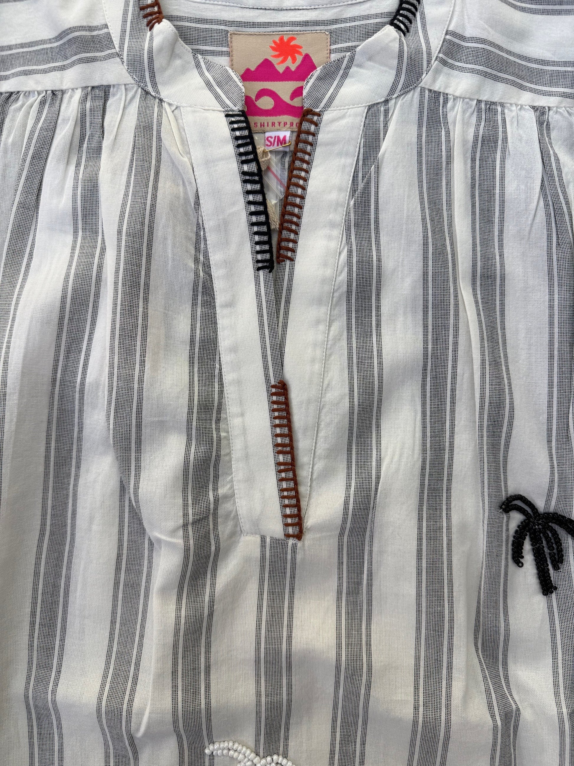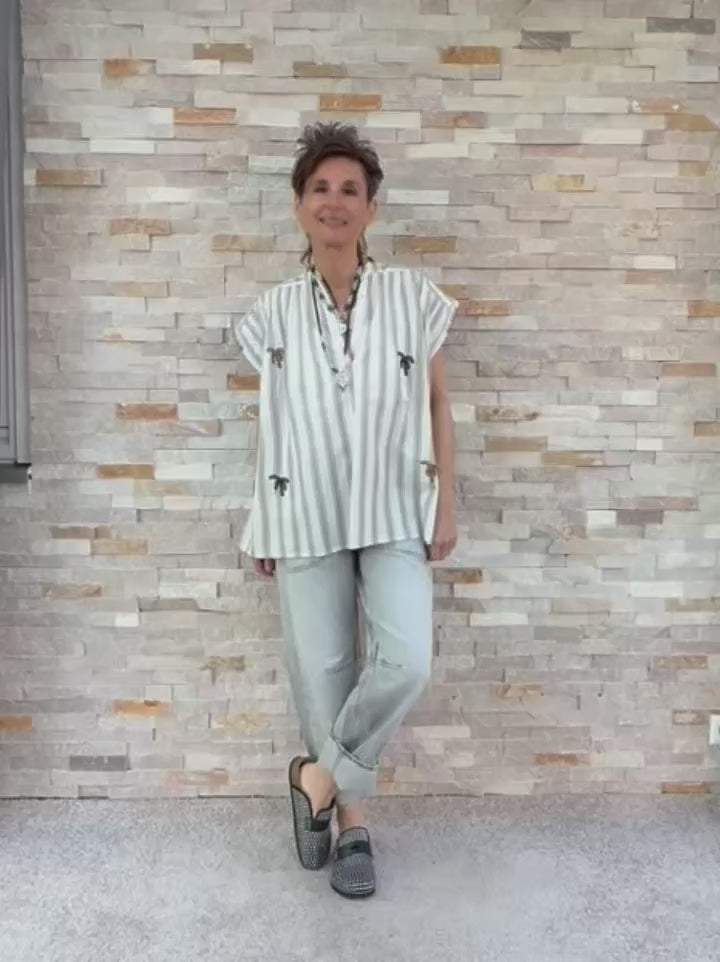 Streifen Tunika ohne Ärmel mit Perlen-Palmen Ecru-Schwarz