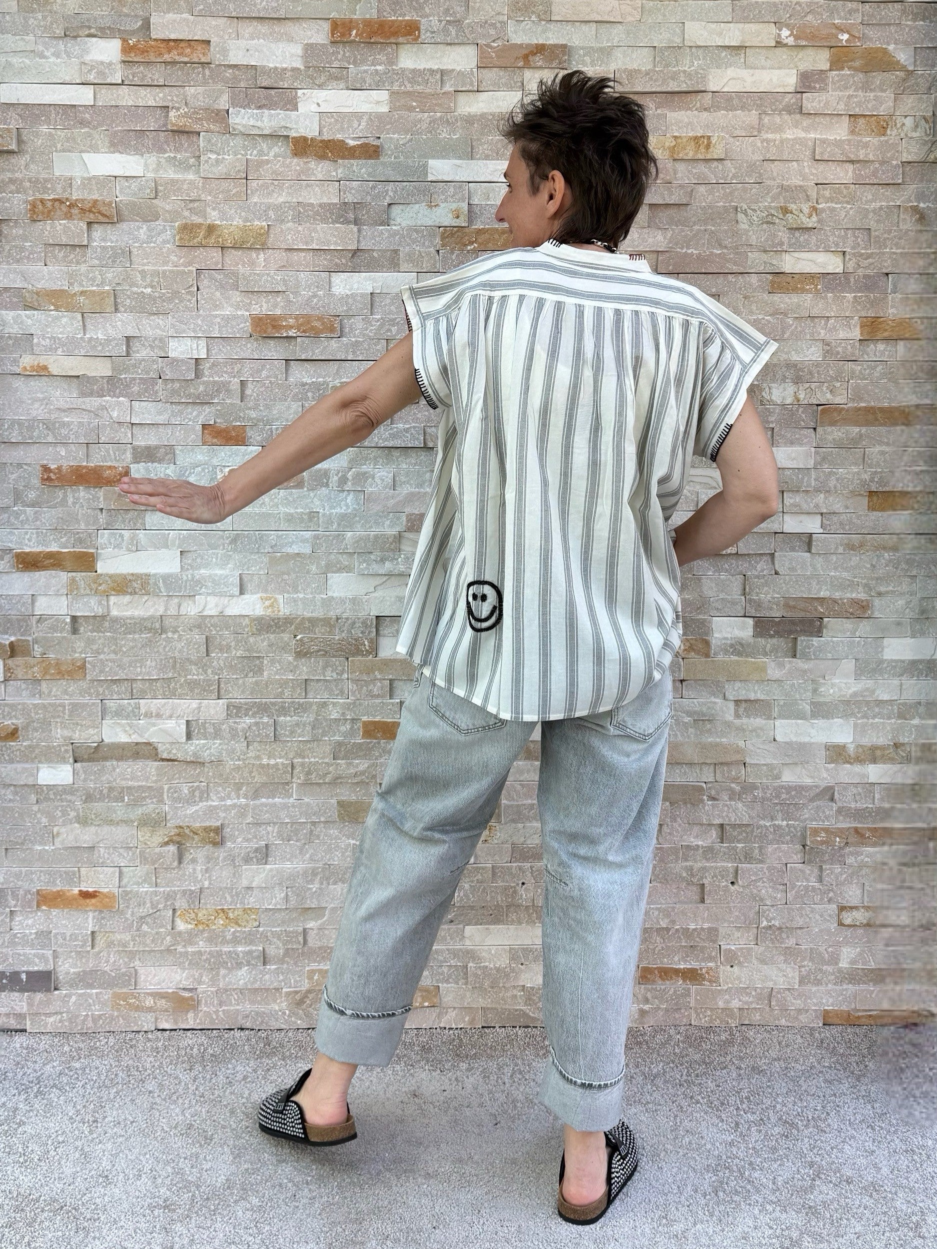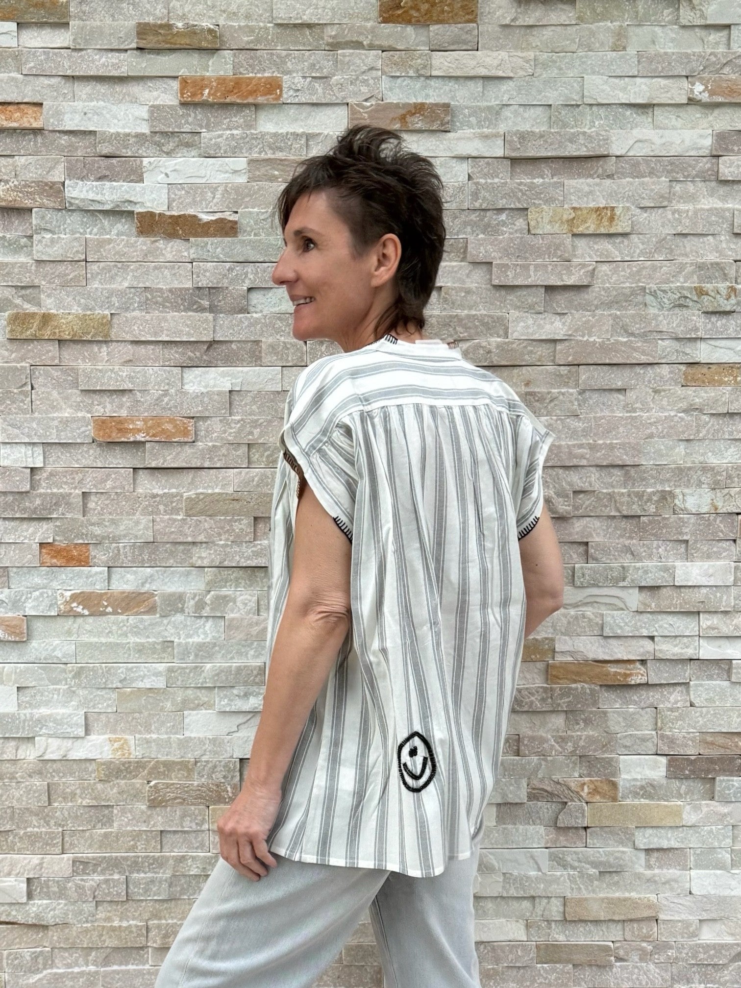 - Smiley Perlenstickerei am Rücken unten links