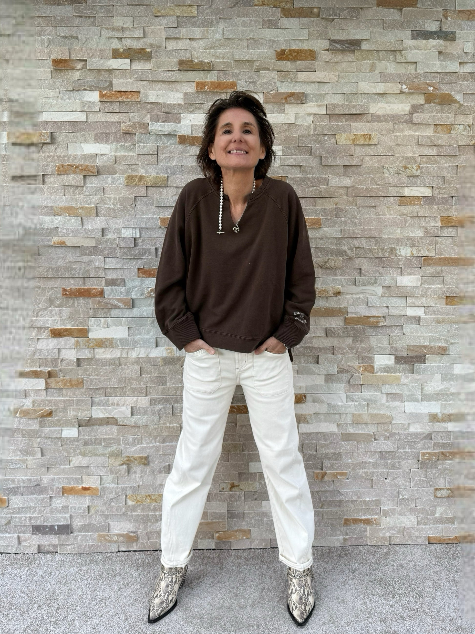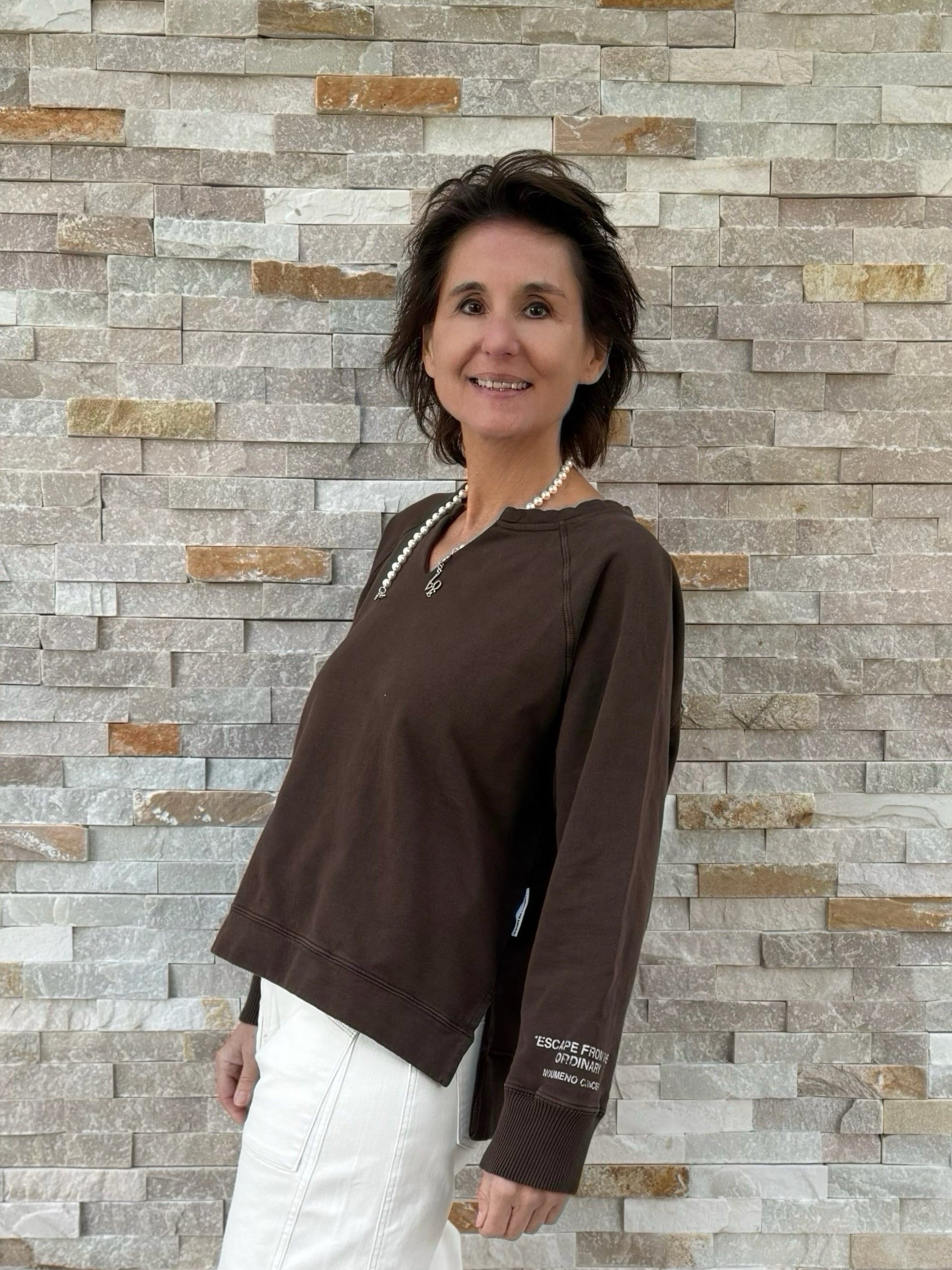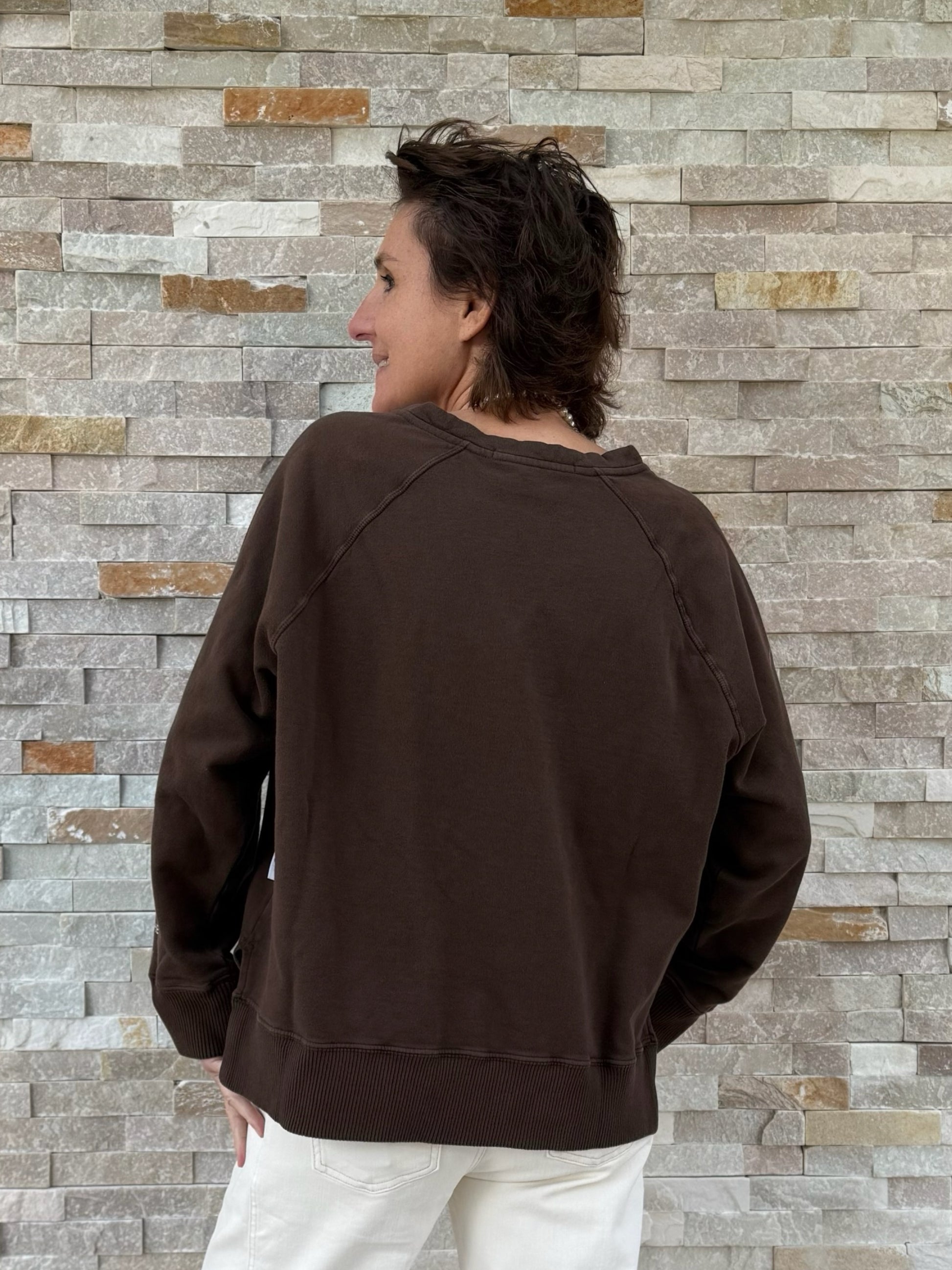 Sweatshirt mit V-Ausschnitt und Schrift am linken Ärmel Chocolate