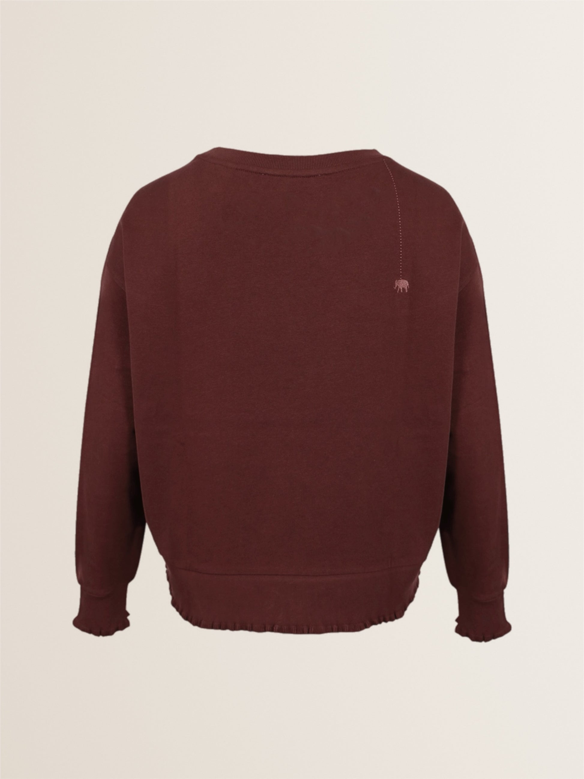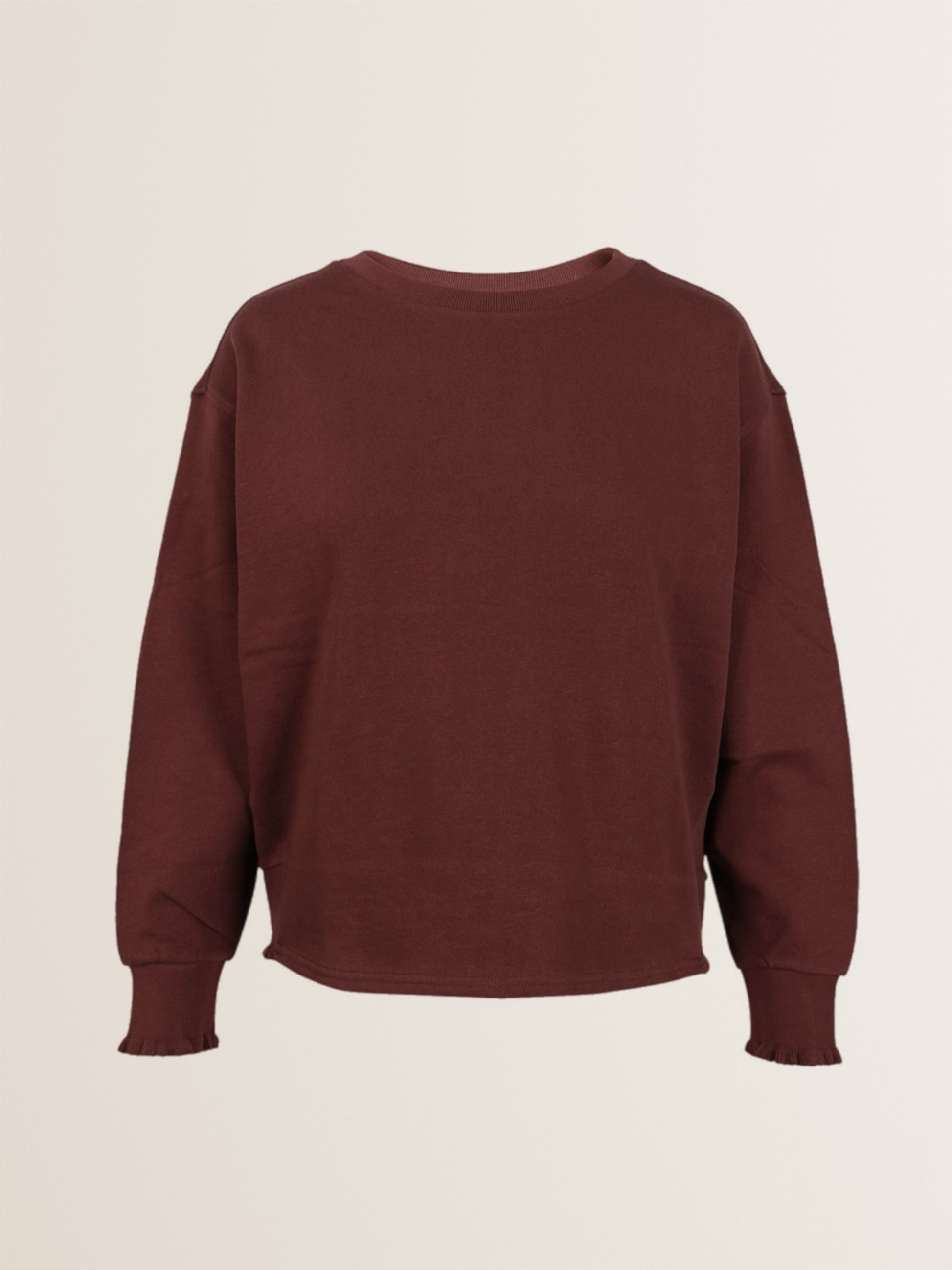 Sweatshirt aus Bio Baumwolle in einem warmen Braun. Kleine Rüschen am Ärmelbündchen und hinten am Saum.